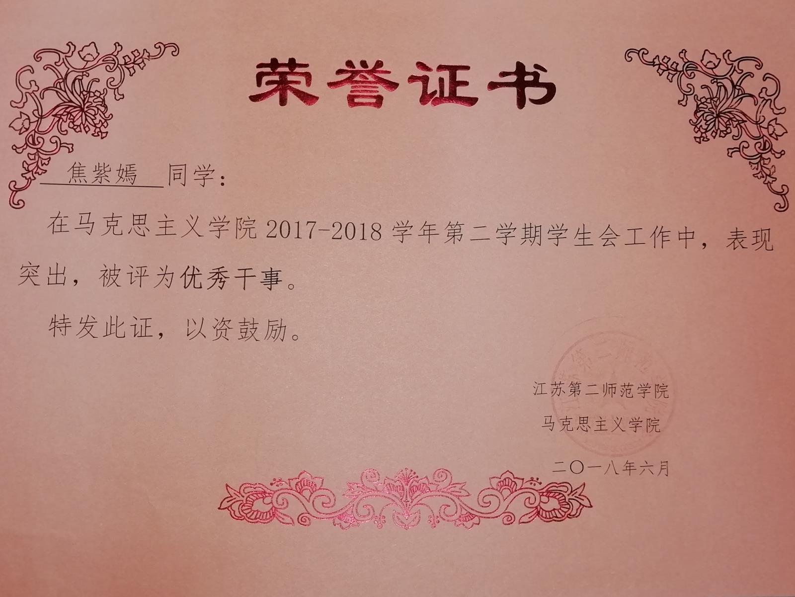 2017-2018学年第二学期学生会优秀干事