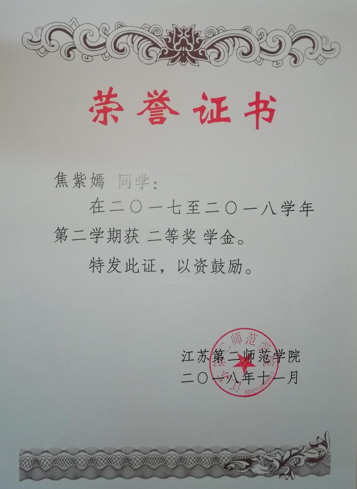 2017-2018学年第二学期获二等奖学金