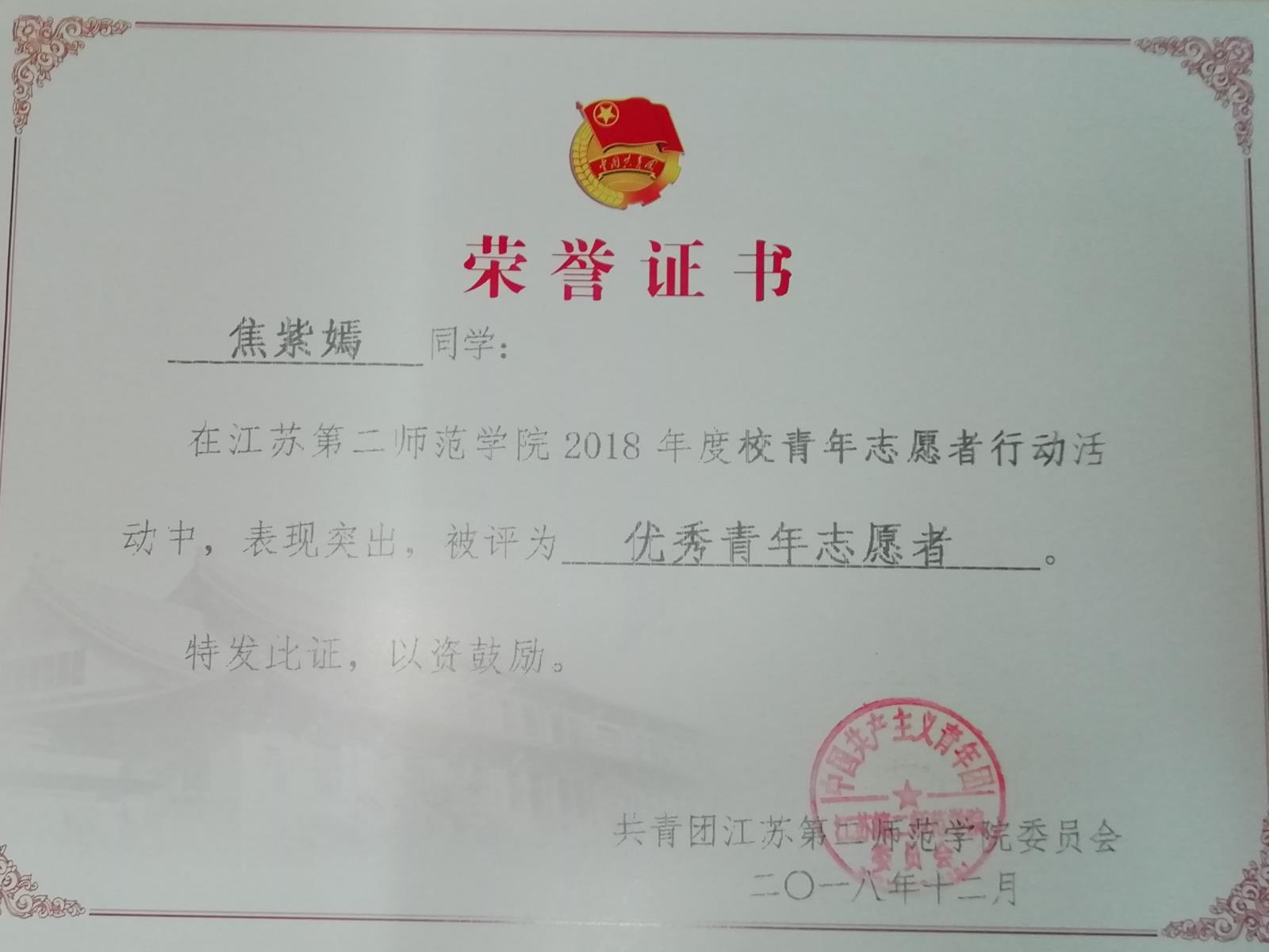 2018年校青年志愿者行动优秀青年志愿者