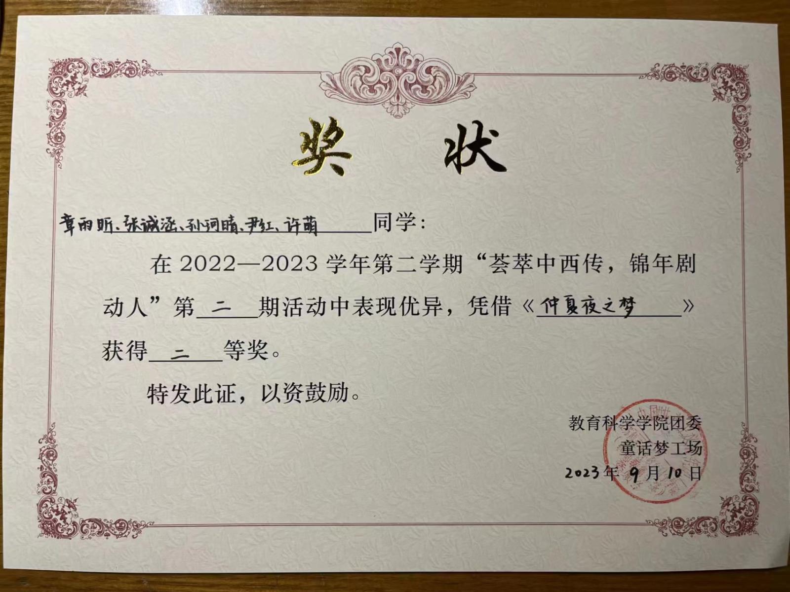话剧表演《仲夏夜之梦》二等奖