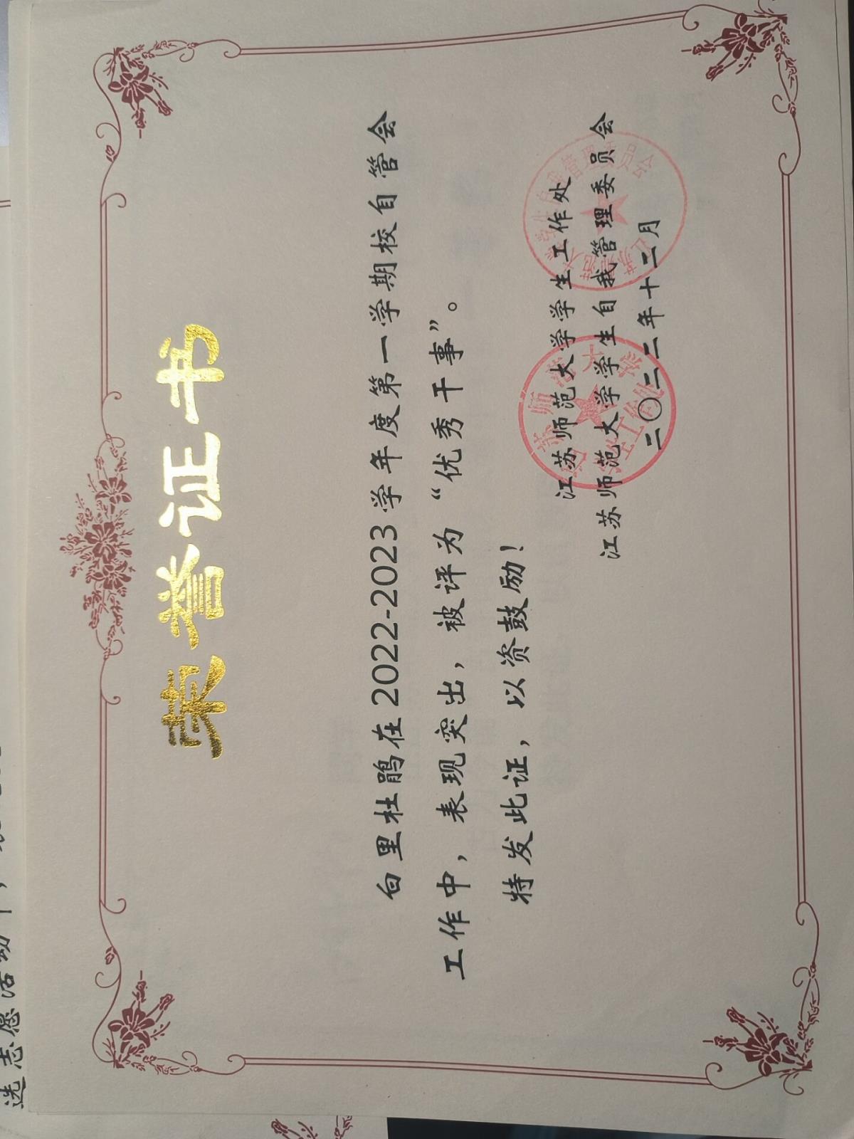 第一学期校自管会“优秀干事”
