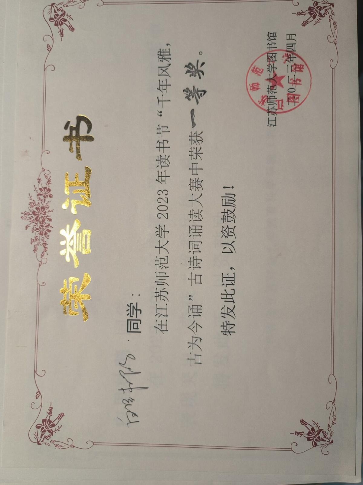 在江苏师范大学2023年读书节“千年风雅,古为今诵”古诗词诵读大赛一等奖