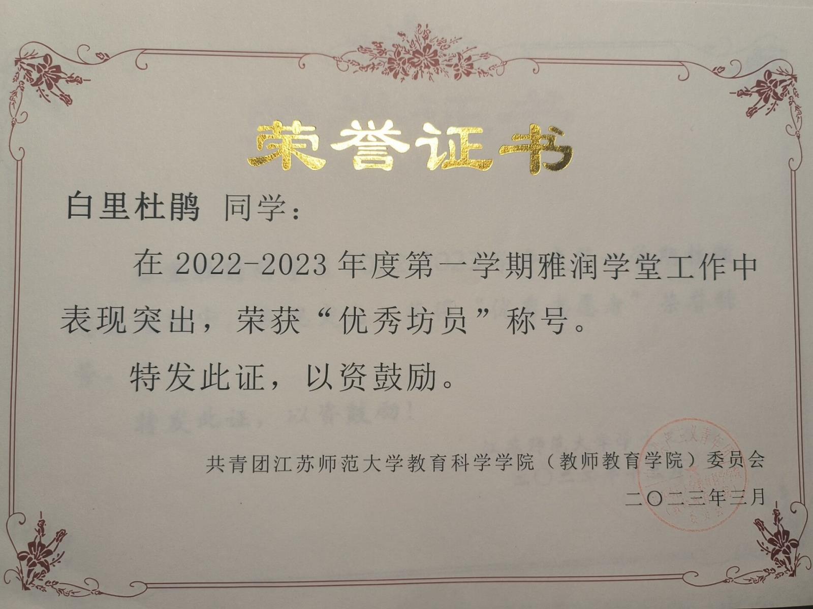 雅润学堂“优秀坊员”