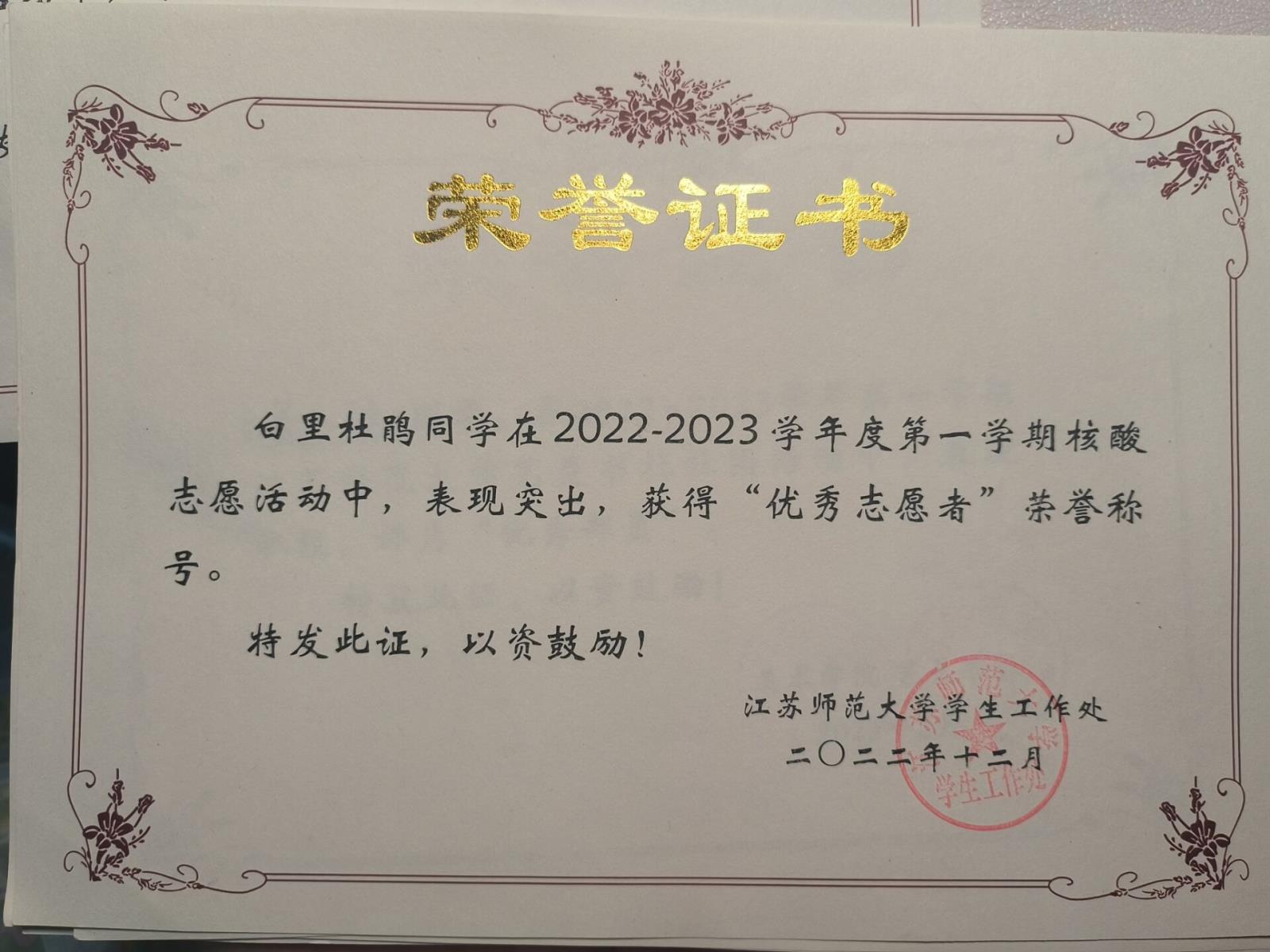 第一学期核酸志愿者活动”优秀志愿者”