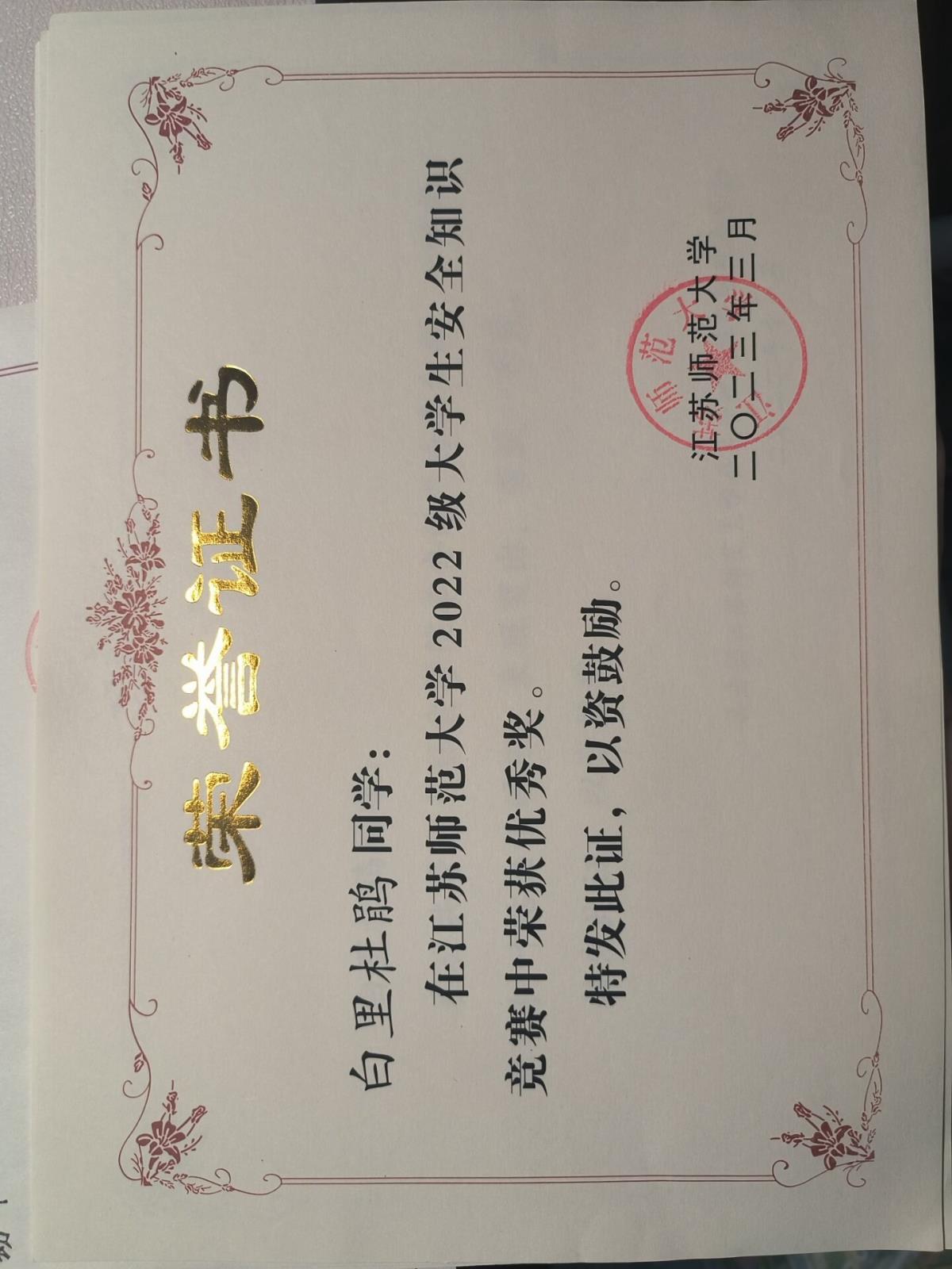在江苏师范大学2022级大学生安全知识竞赛优秀奖