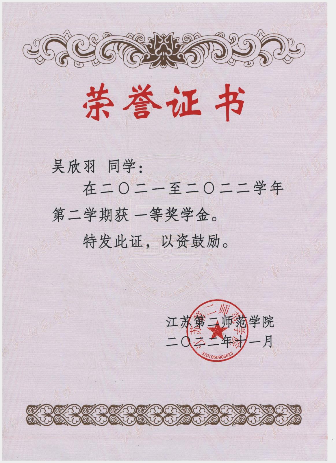 2021-2022学年第二学期一等奖学金