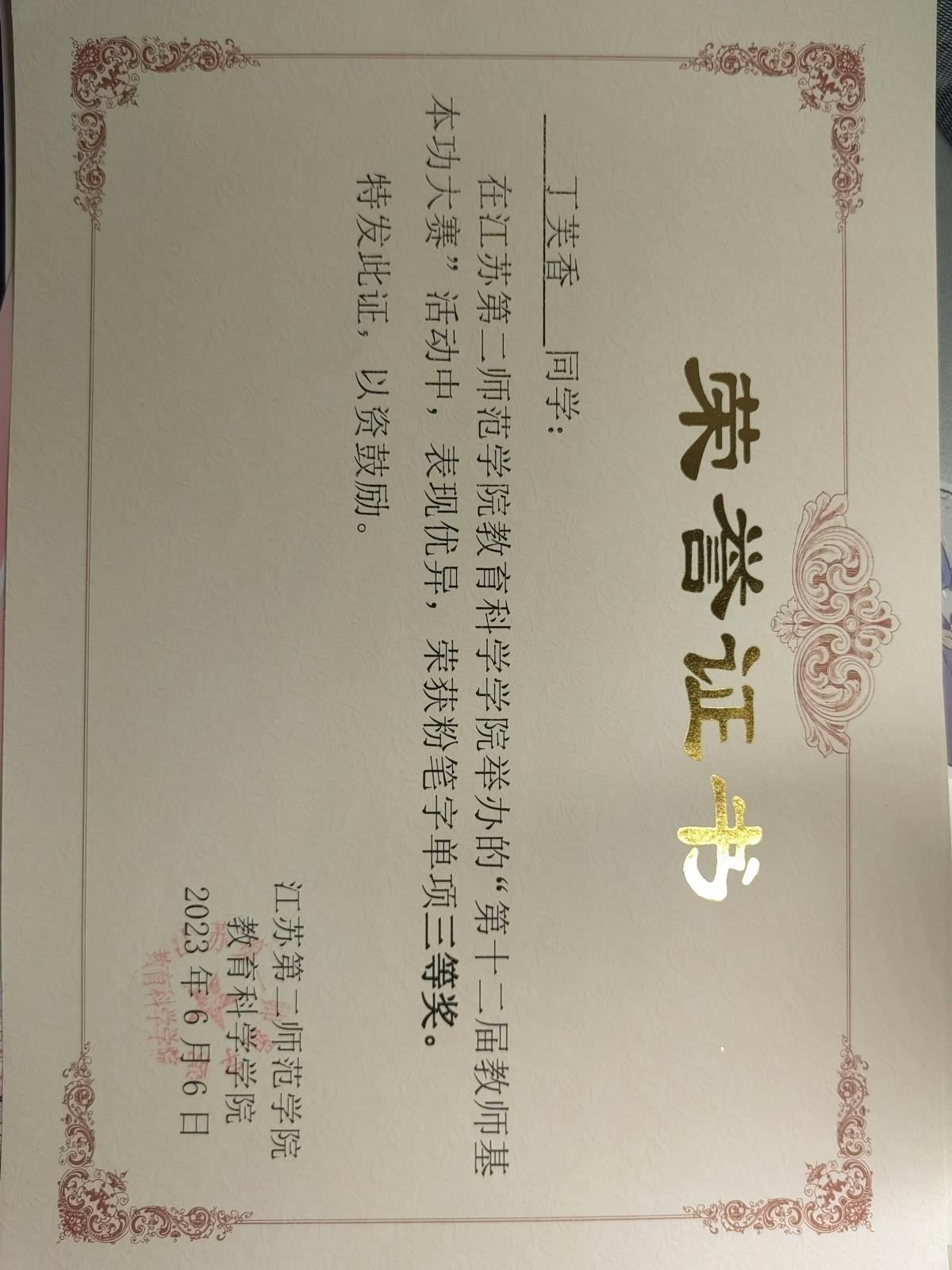 教师基本功比赛粉笔字单项三等奖