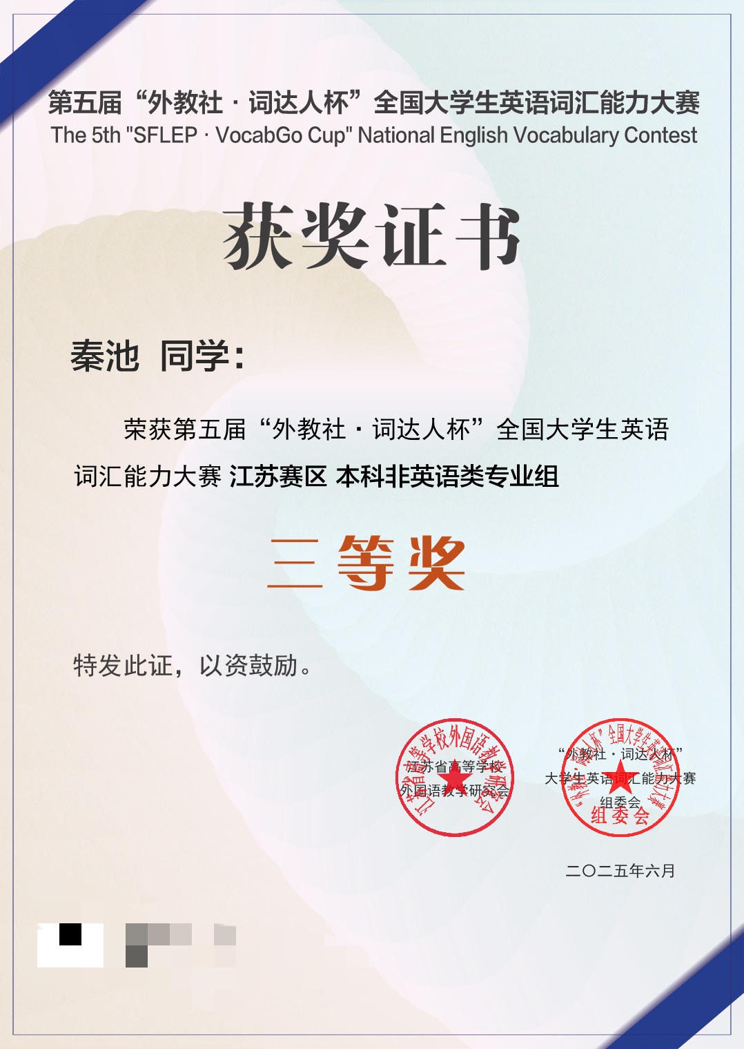 第五届外教社词达人杯全国大学生英语词汇能力大赛江苏省三等奖