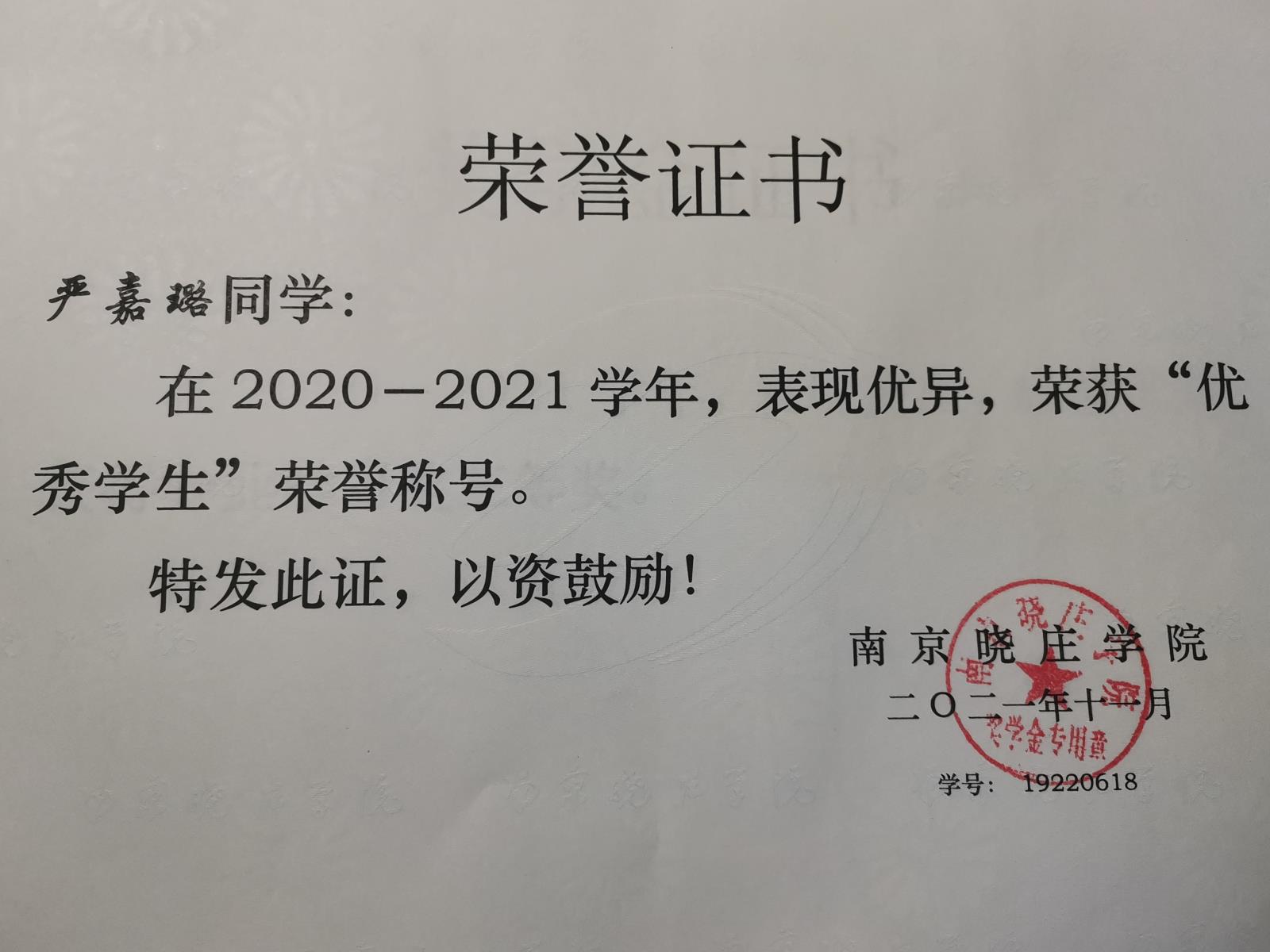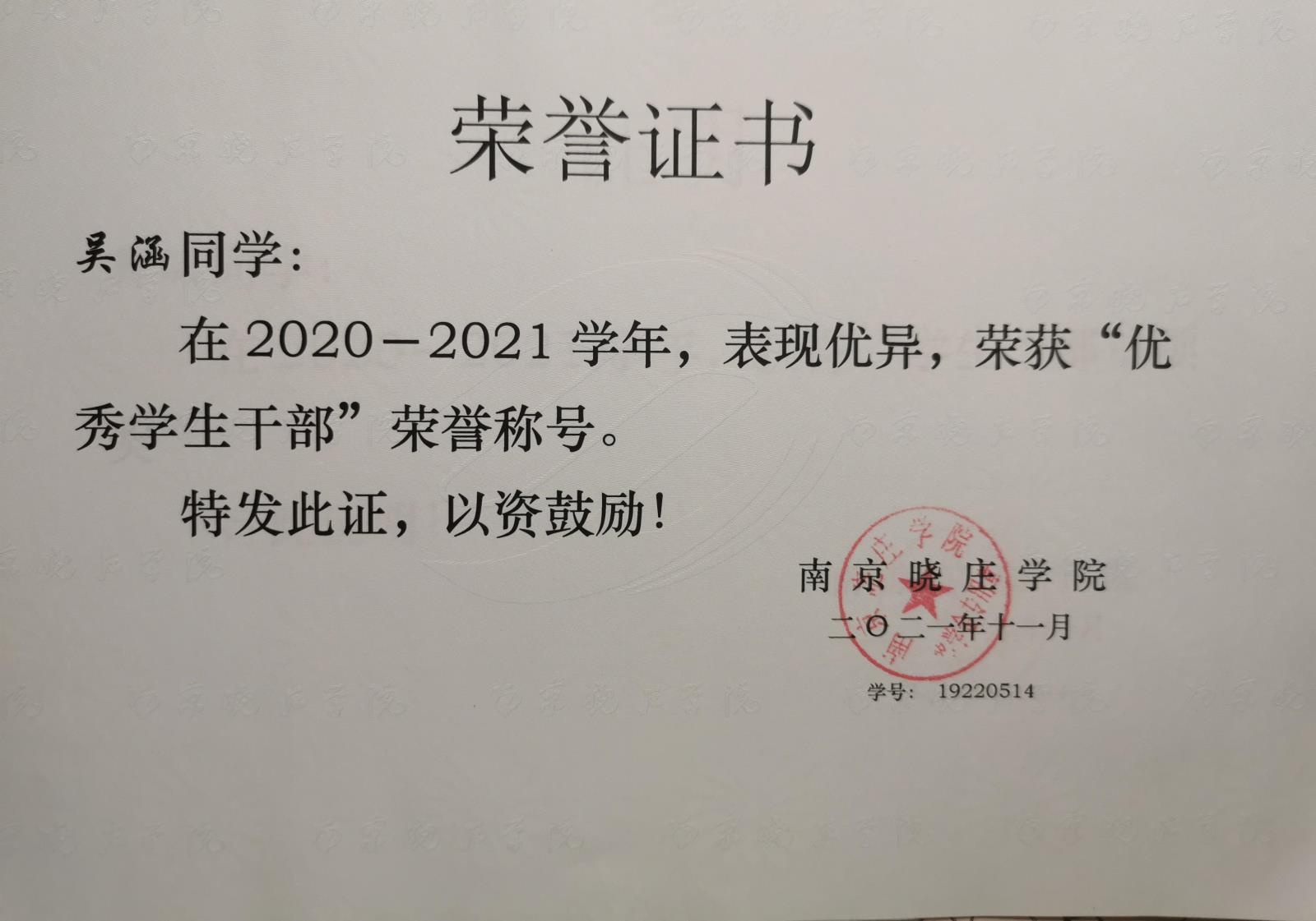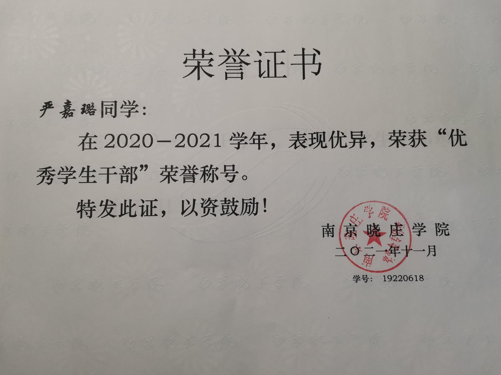 “优秀学生干部”荣誉证书