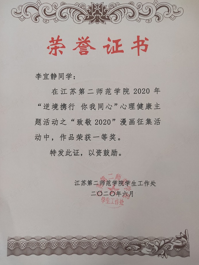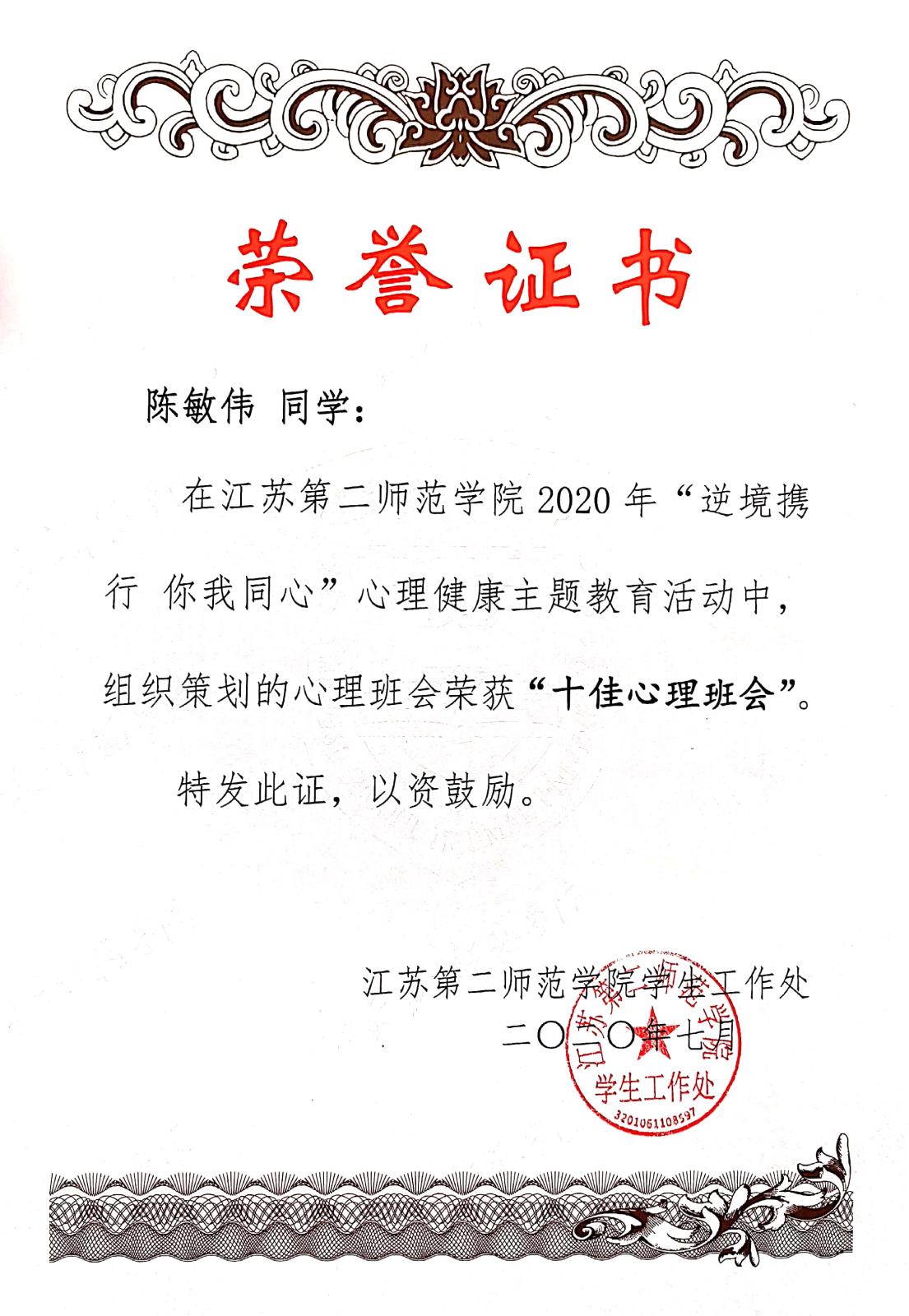在江苏第二师范学院2020年“逆境携行 你我同心”心理健康主题活动中,组织策划的心理班会荣获“十佳心理班会”