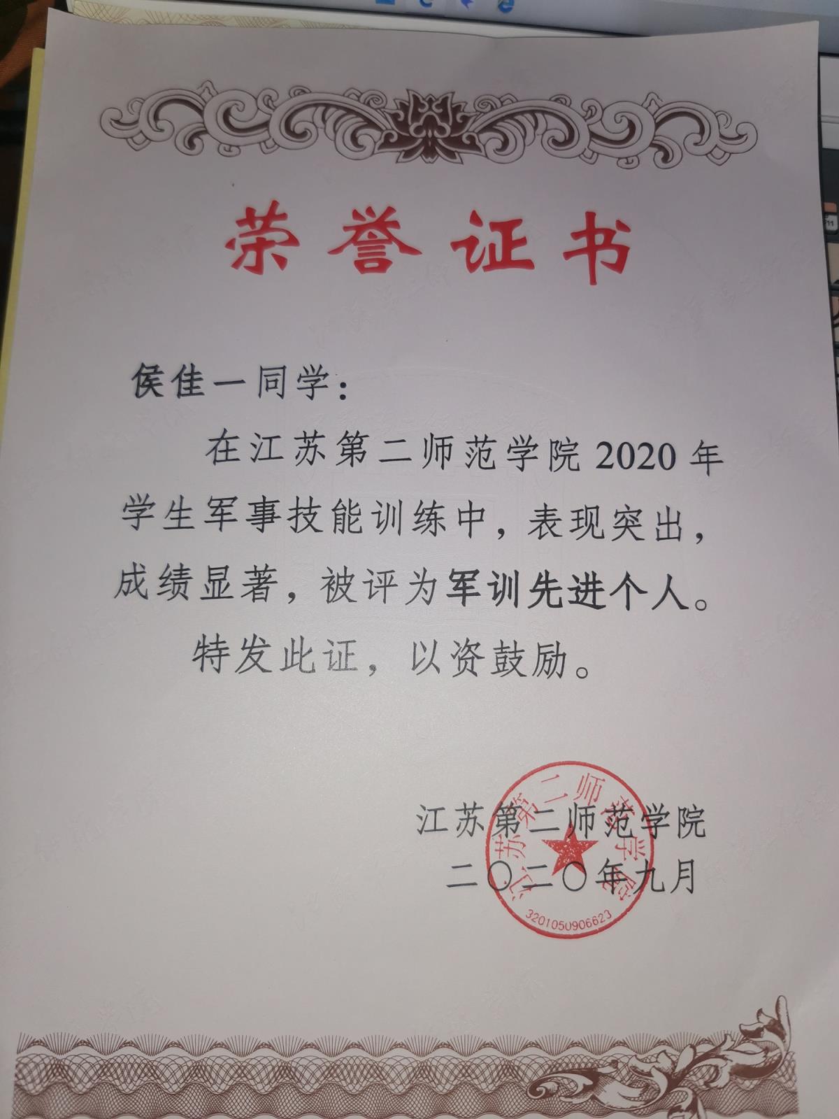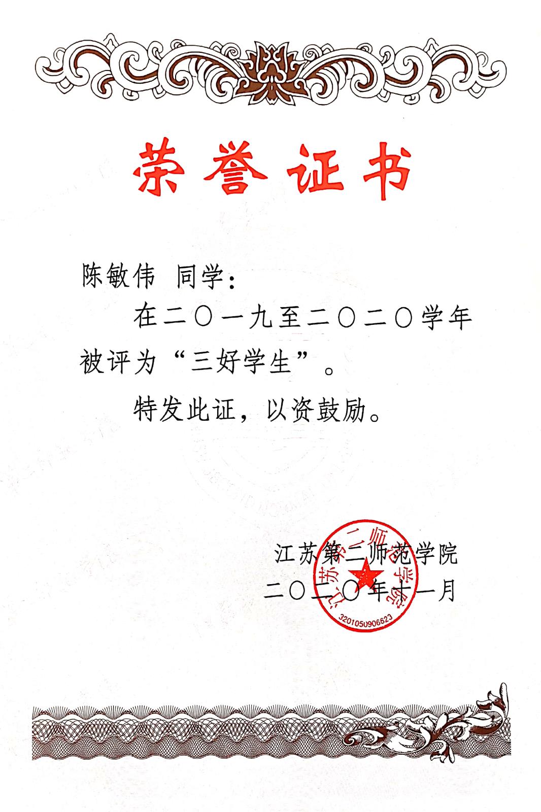 在二〇一九至二〇二〇学年被评为“三好学生”