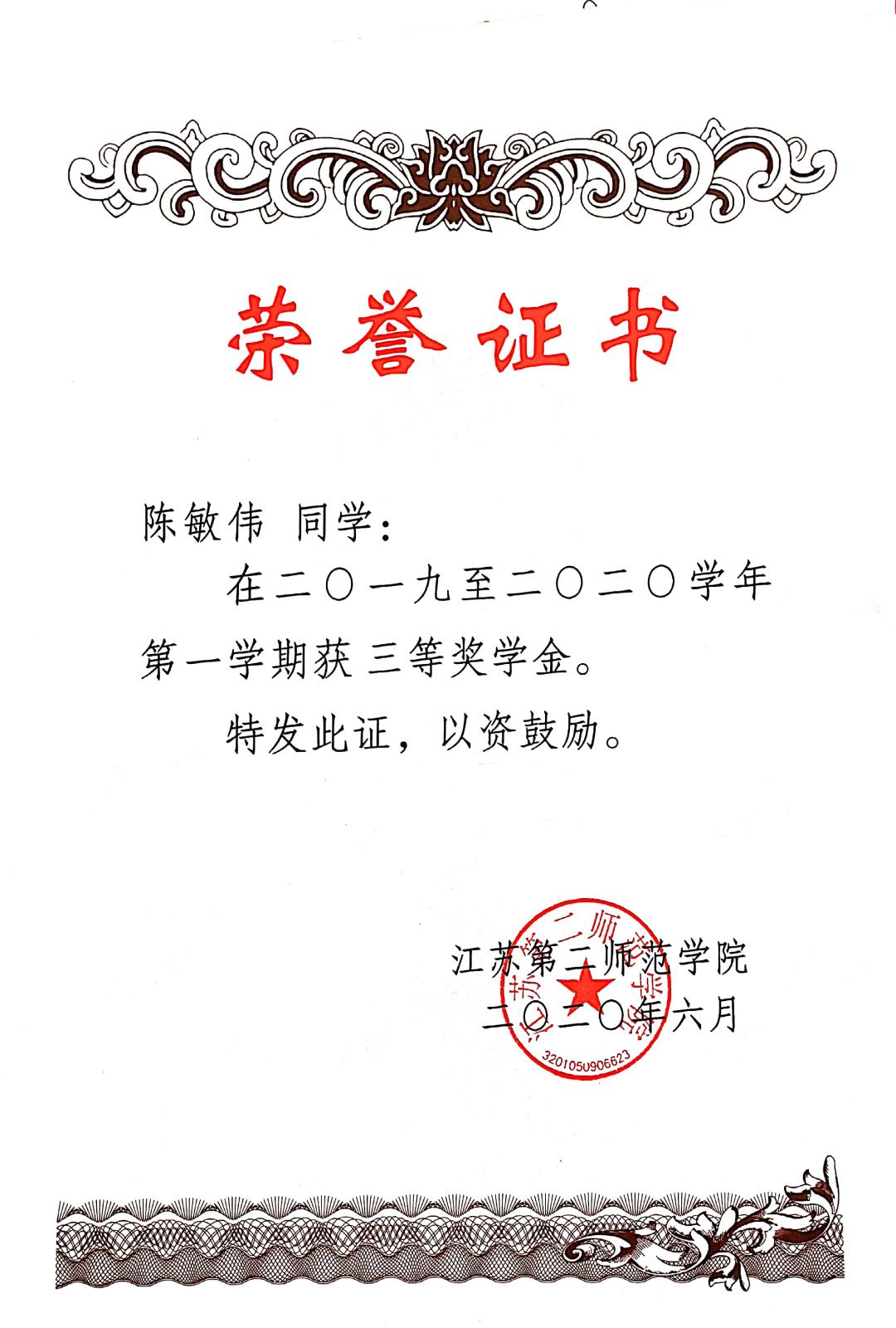 在江苏第二师范学院二〇一九至二〇二〇学年第一学期获三等奖学金