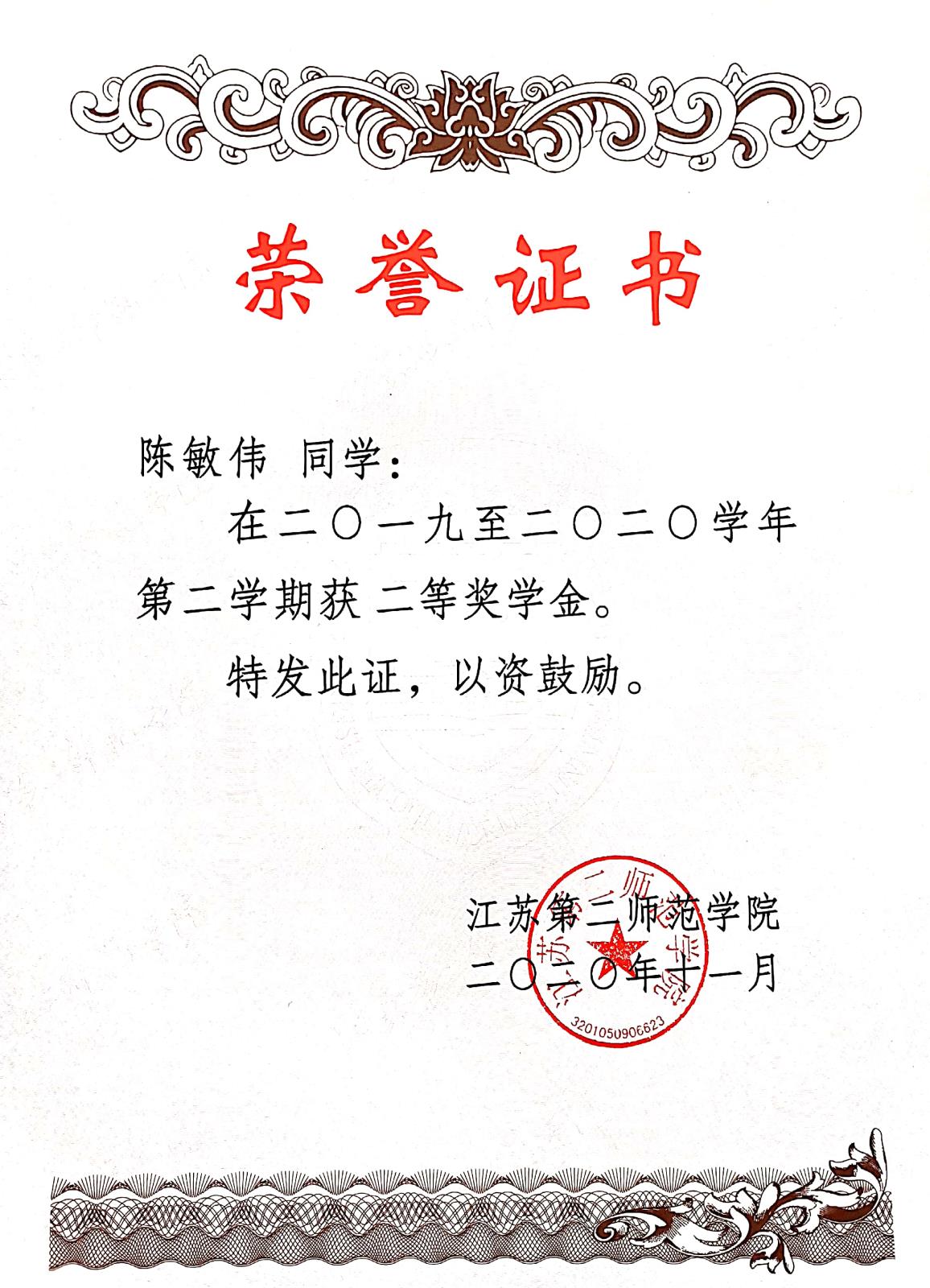 在江苏第二师范学院二〇一九至二〇二〇学年第二学期获二等奖学金