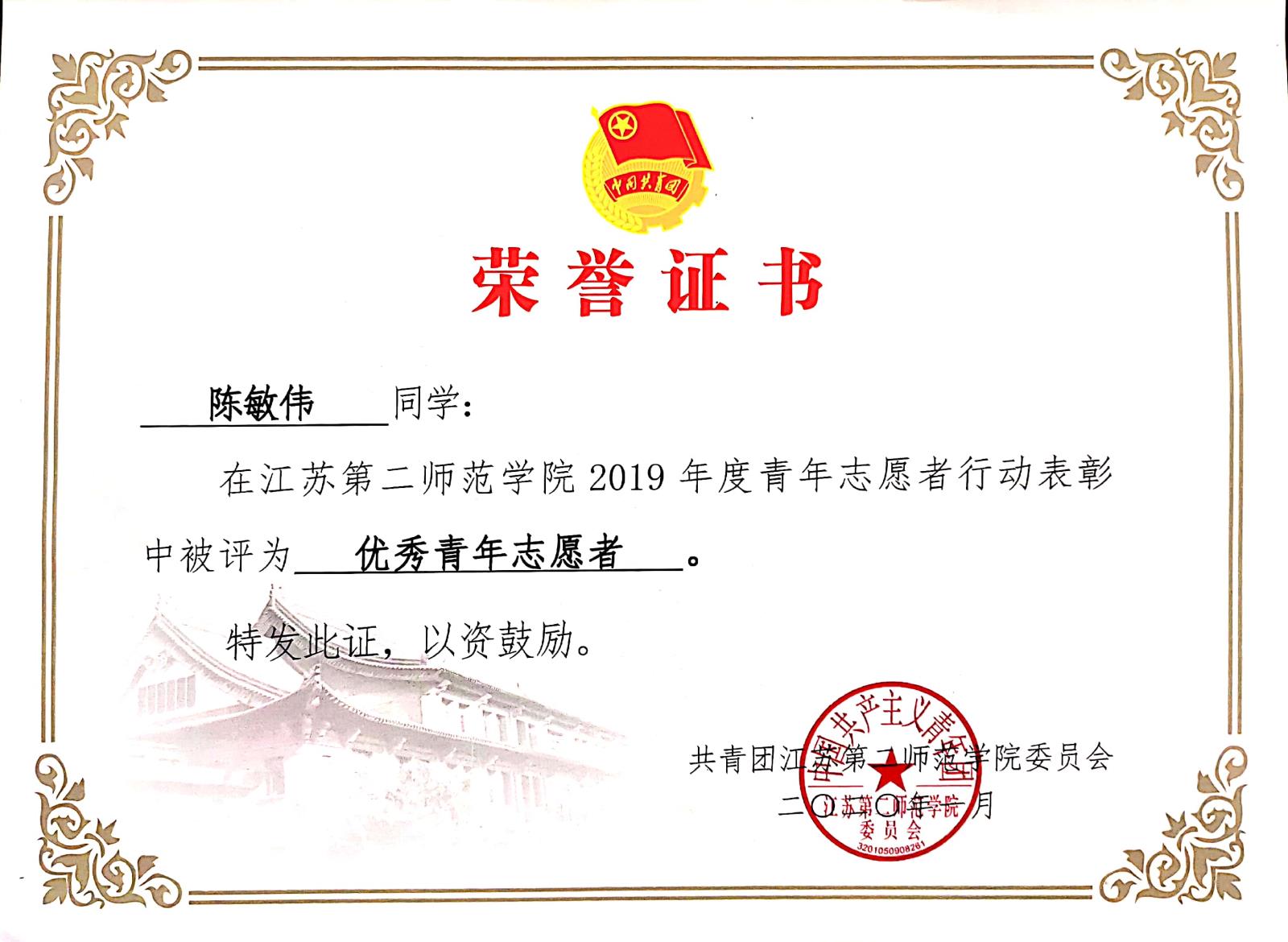 在江苏第二师范学院2019年度青年志愿者行动表彰中被评为优秀青年志愿者