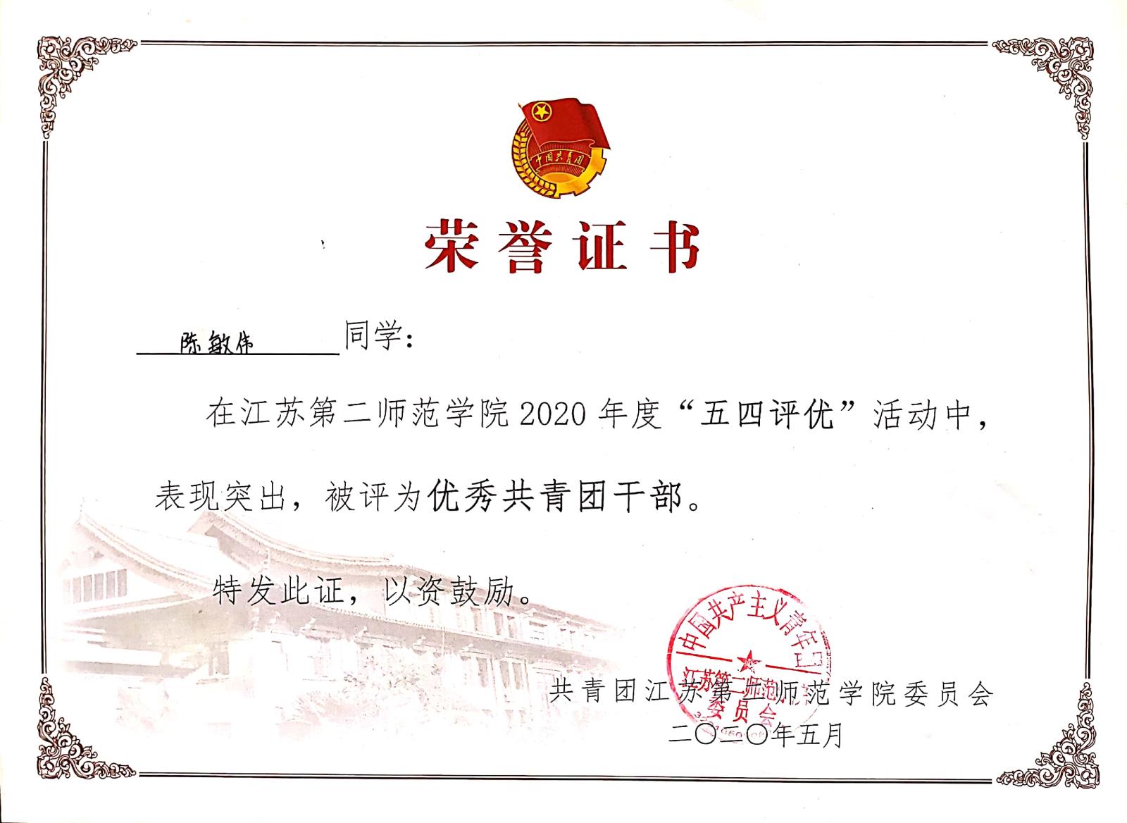 在江苏第二师范学院2020年度“五四评优”活动中,被评为优秀共青团干部