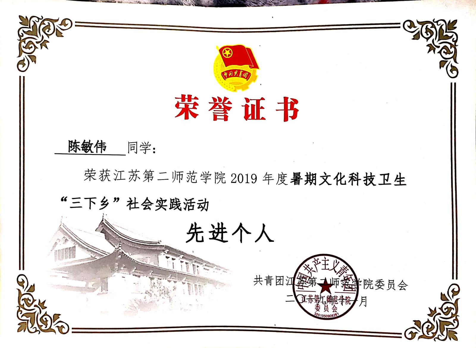 江苏第二师范学院2019年度暑期文化科技卫生社会“三下乡”社会实践活动先进个人
