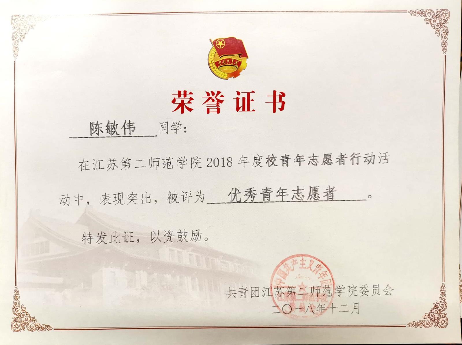 江苏第二师范学院2018年度校青年志愿者行动优秀青年志愿者