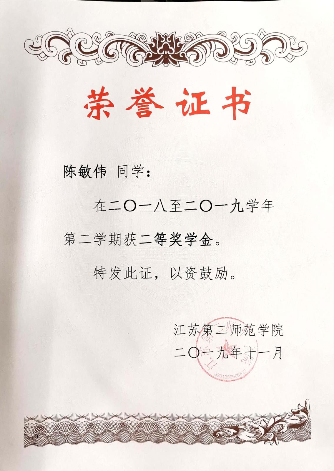 江苏第二师范学院二〇一八至二〇一九学年第二学期二等奖学金