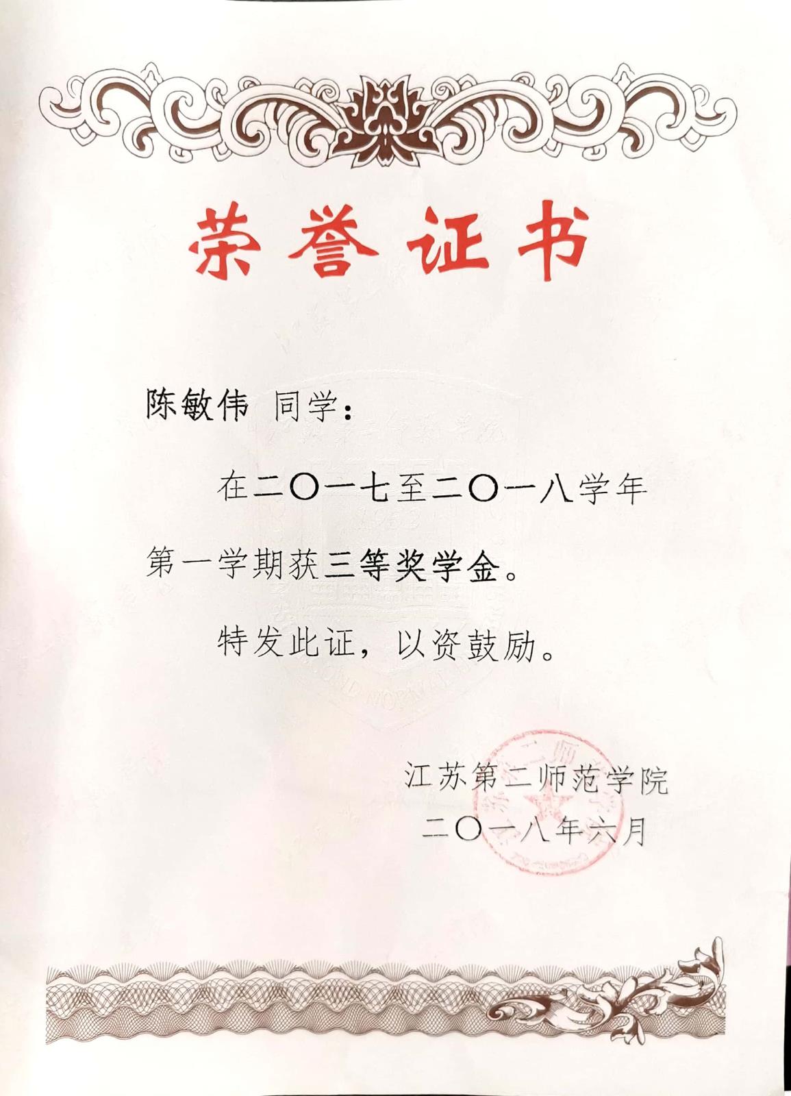 在2017-2018学年被评为“三好学生”