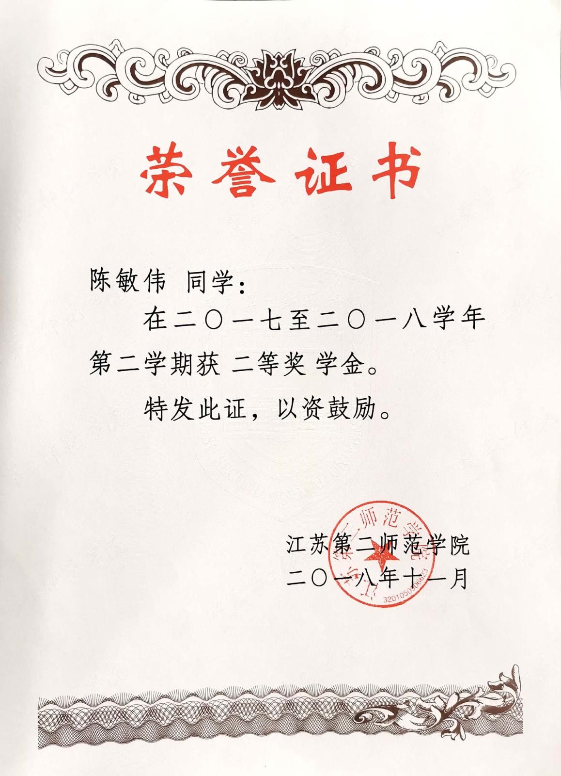 江苏第二师范学院二〇一七至二〇一八学年第二学期二等奖学金