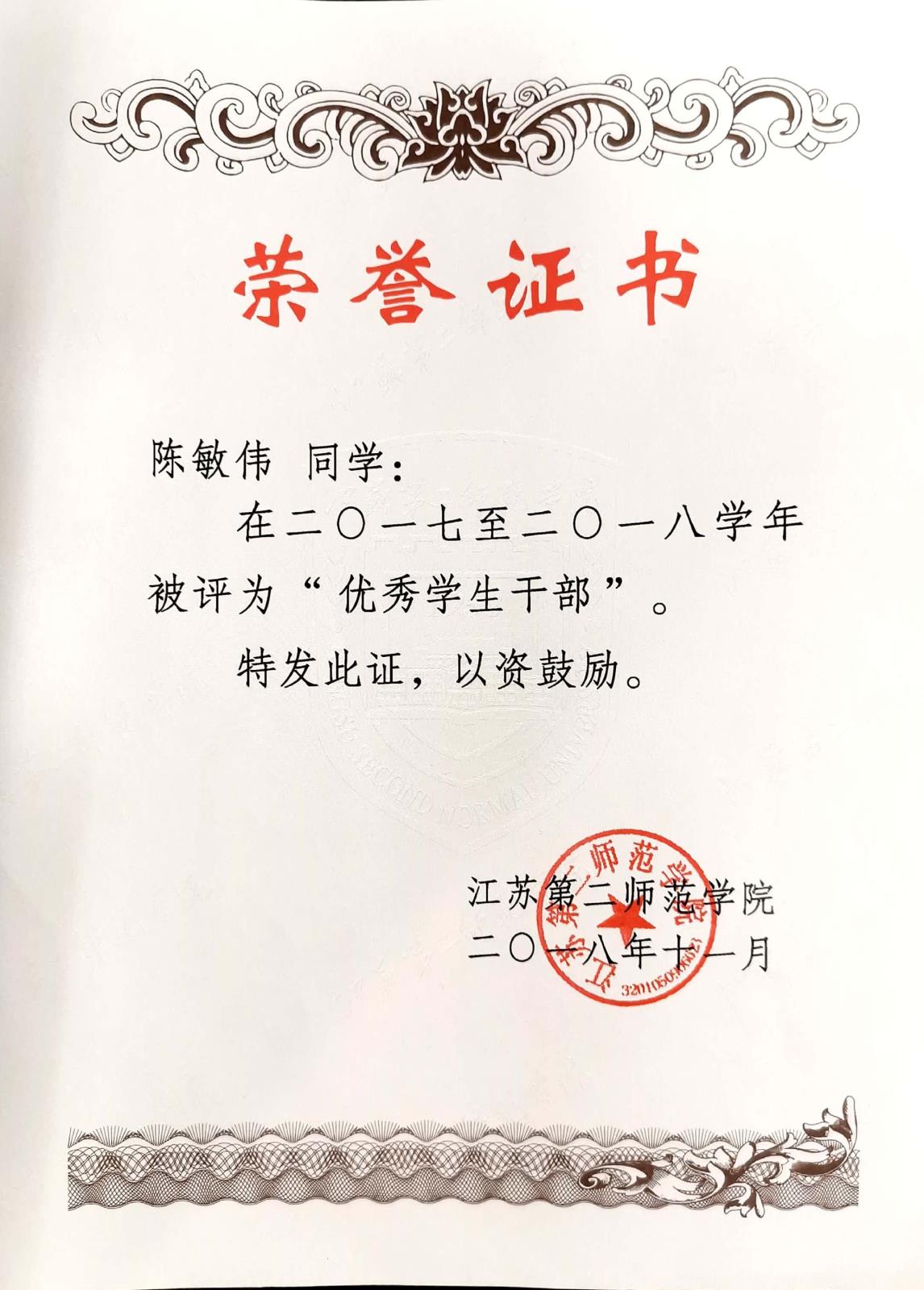江苏第二师范学院二〇一七至二〇一八学年优秀学生干部