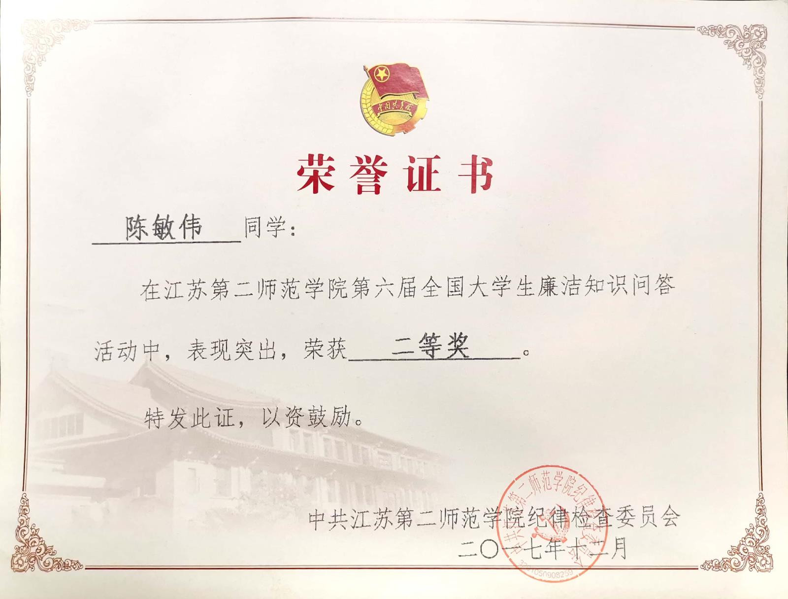 江苏第二师范学院第六届全国大学生廉洁知识问答活动二等奖