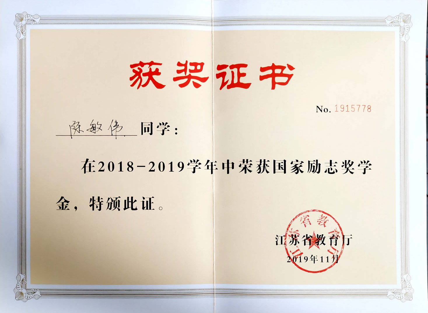 在2018-2019学年中荣获国家励志奖学金