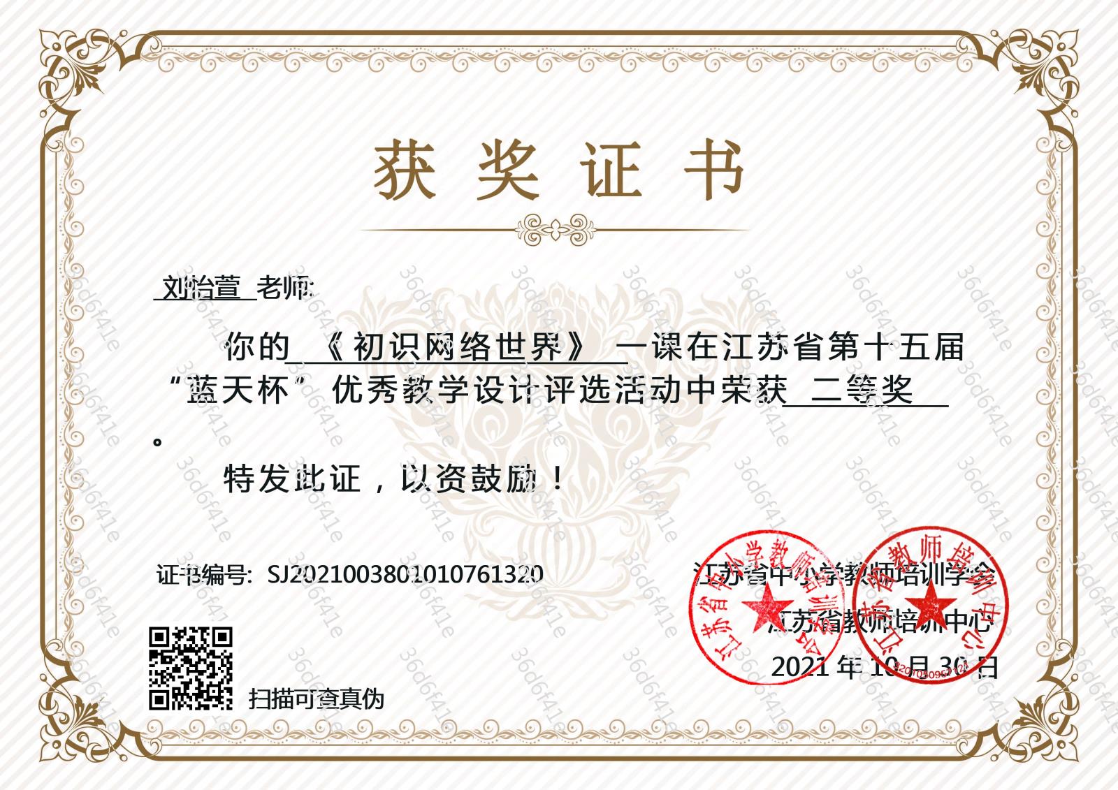 江苏省第十五届“蓝天杯”优秀教学设计二等奖