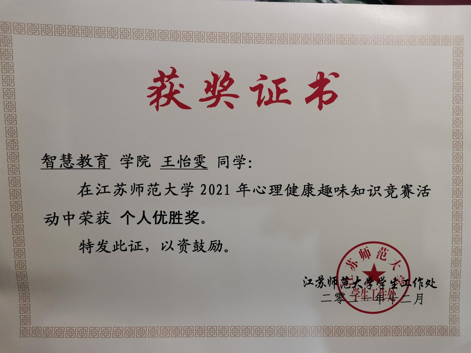 校心理趣味知识竞赛个人优胜奖