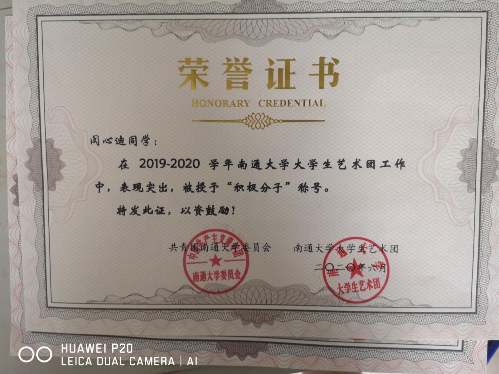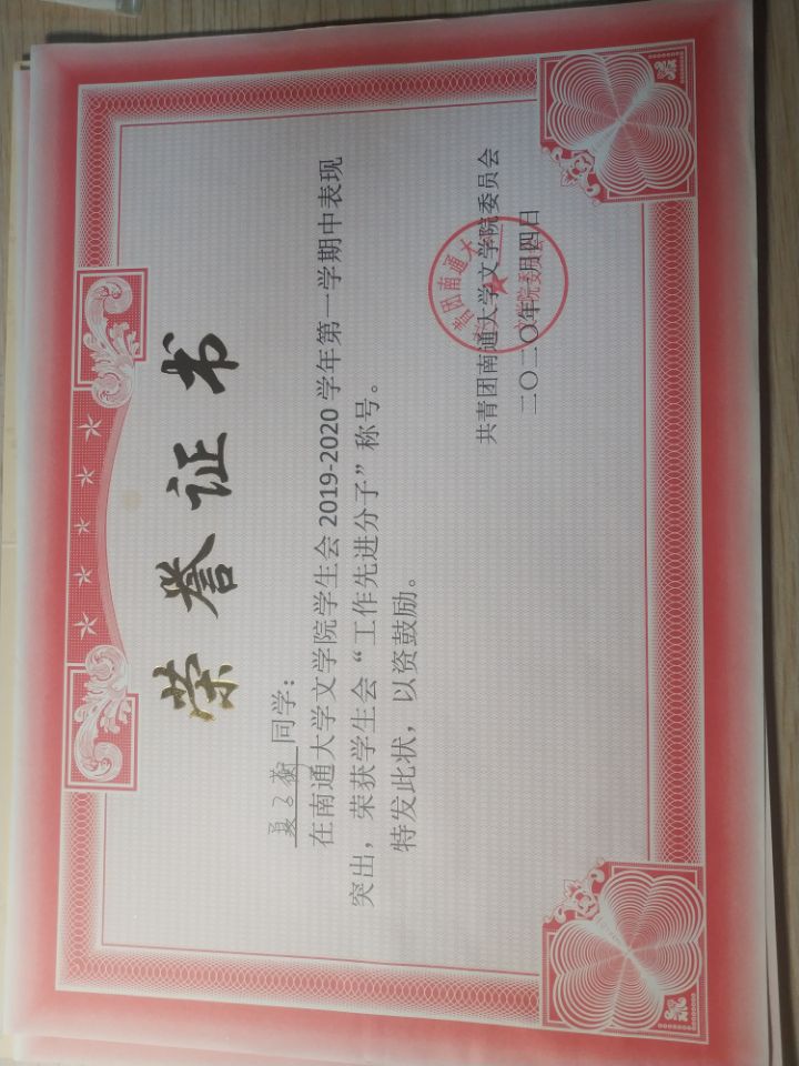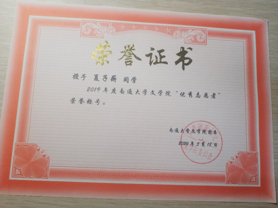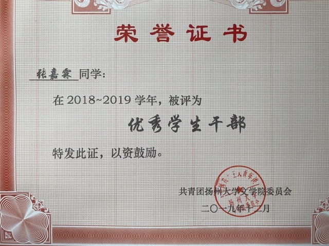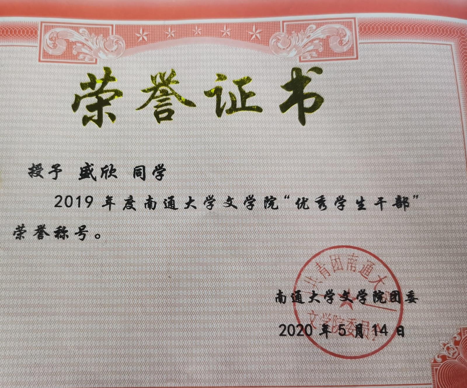 2019年度南通大学文学院”优秀学生干部“