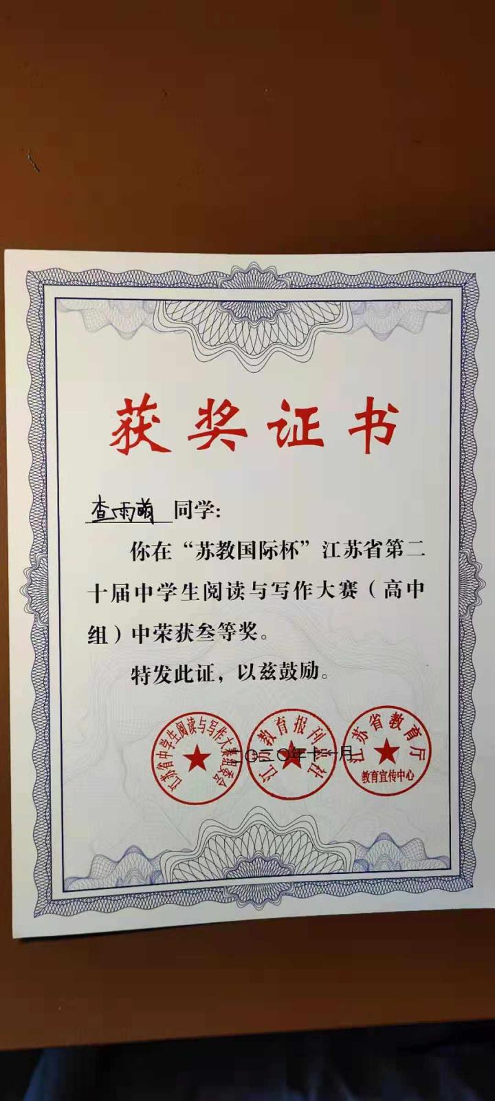 苏教国际杯江苏省第二十届中学生阅读与写作大赛(高中组)三等奖