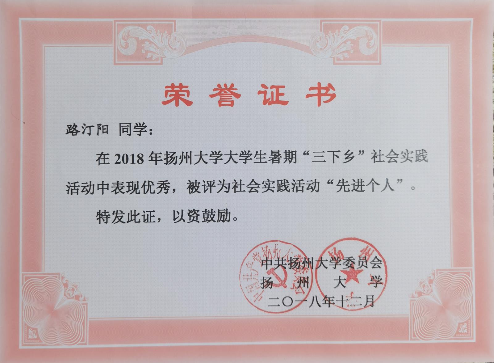 2018年扬州大学暑期“三下乡”社会实践活动校“先进个人”