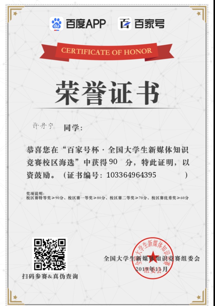 “百家号杯·全国大学生新媒体知识竞赛校区海选”校区赛特等奖