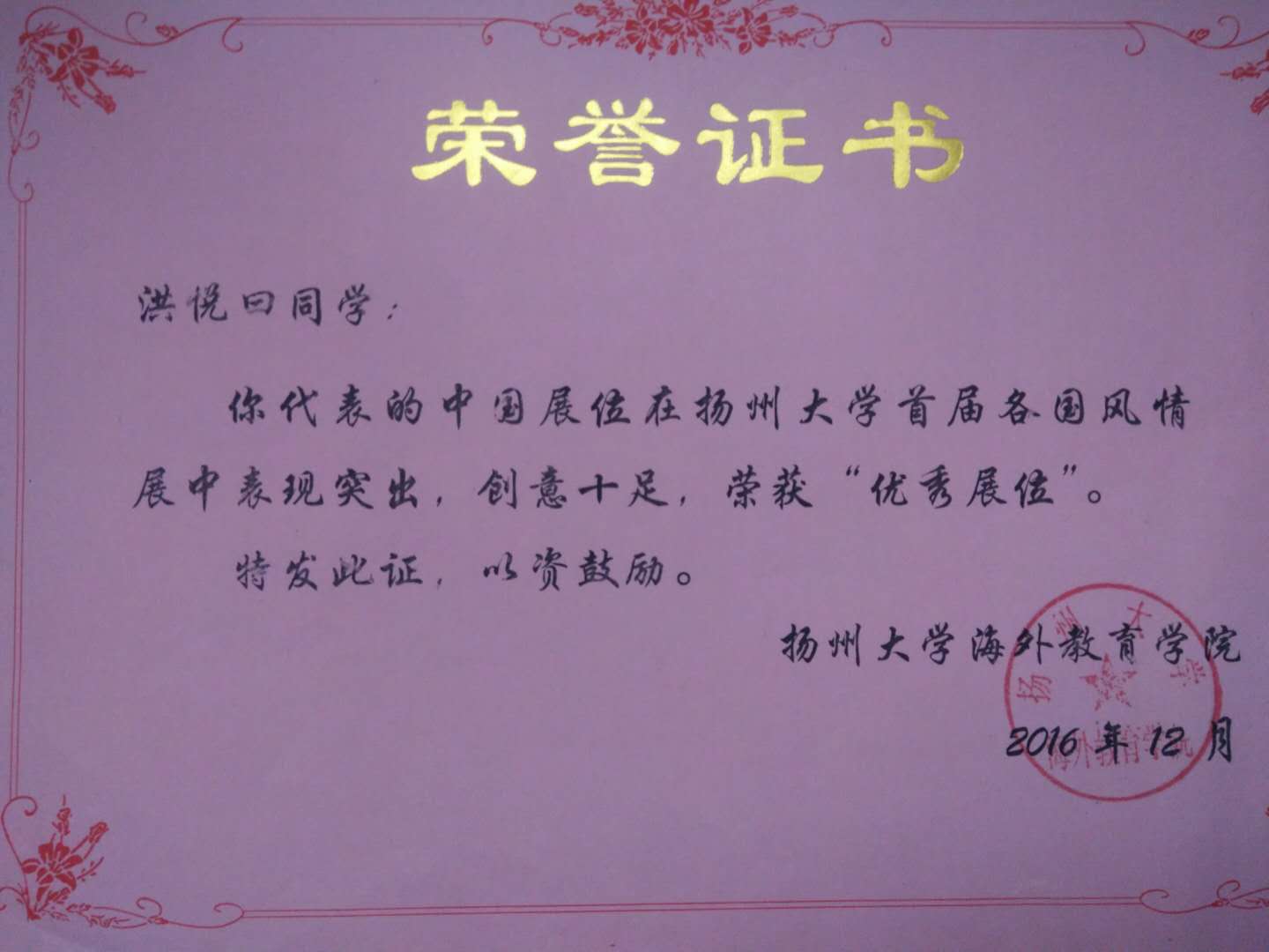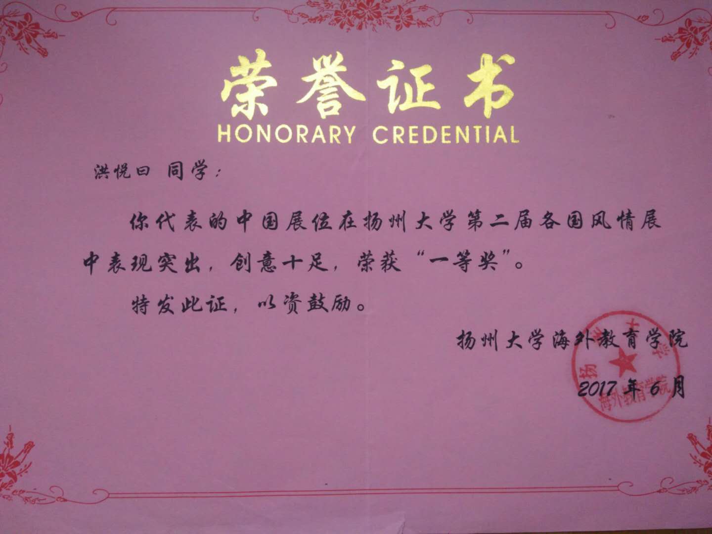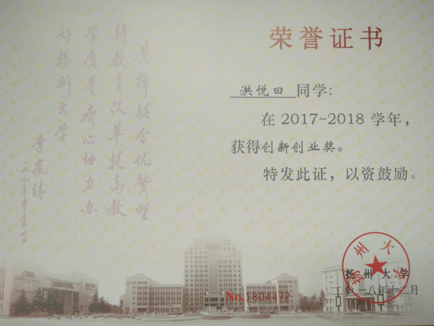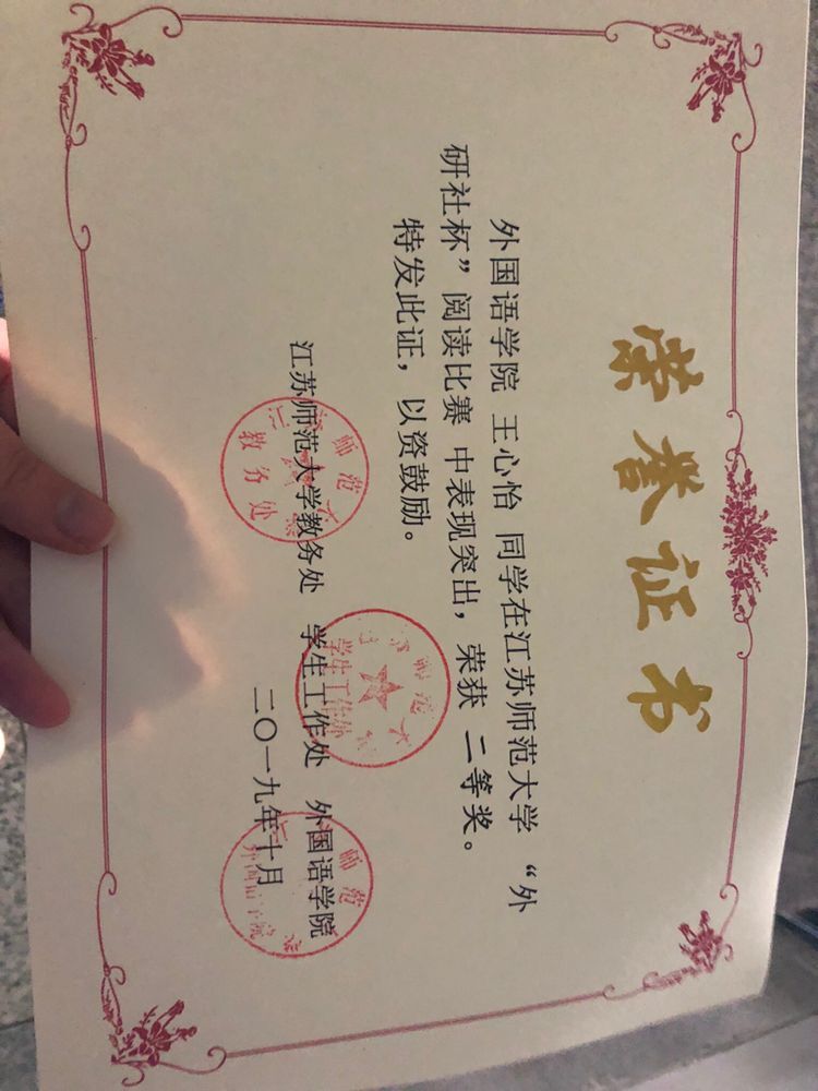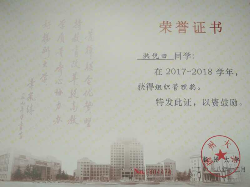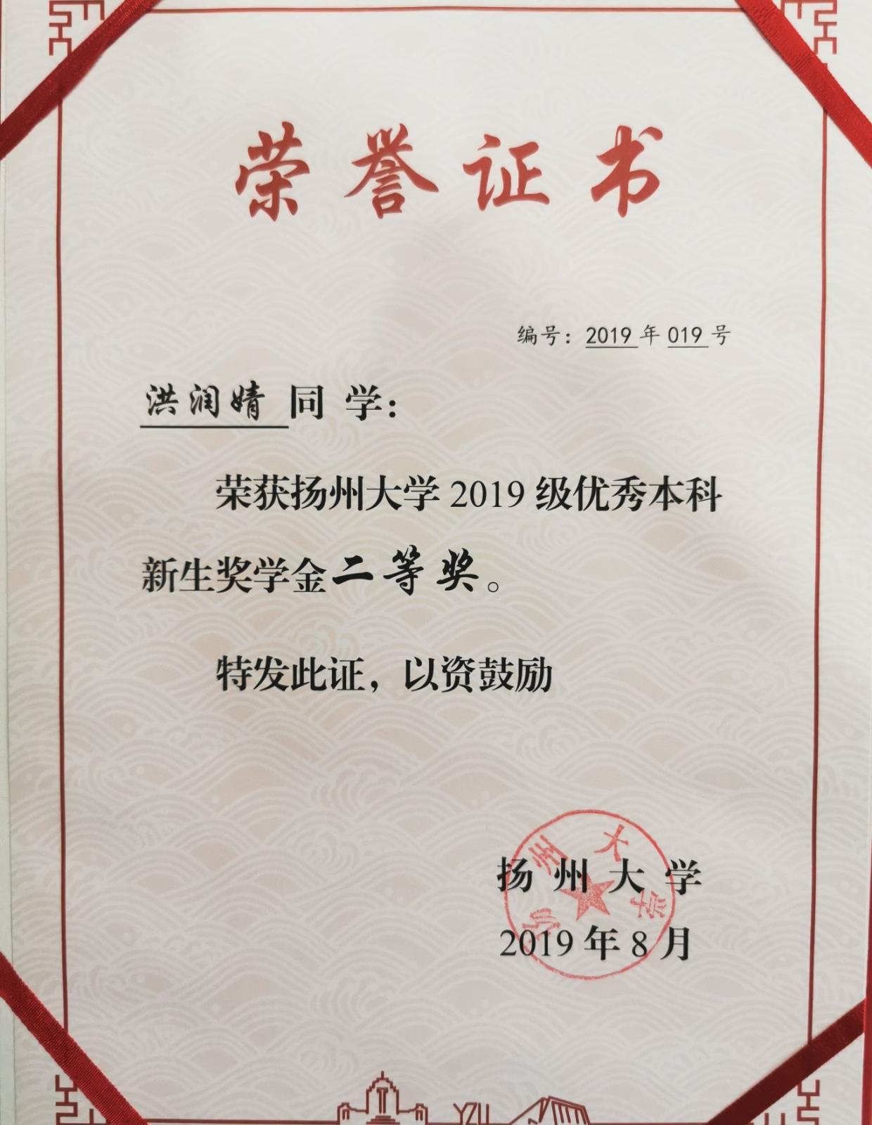 扬州大学本科新生入学奖学金二等奖