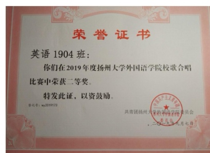 扬州大学外国语校歌合唱比赛二等奖
