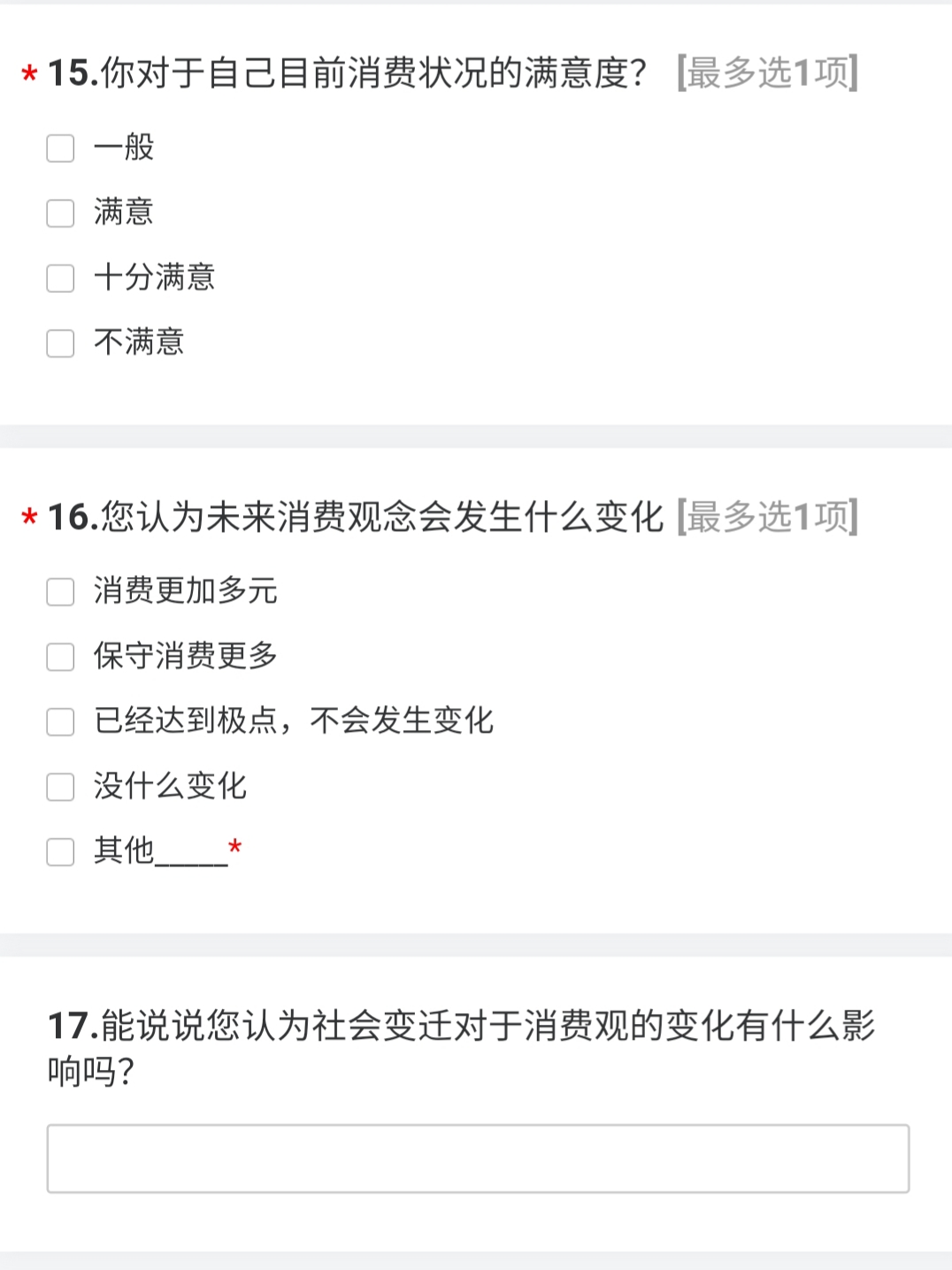 我们小组选择的题目是社会变迁和消费观的变化。从计划经济到改革开放,再从改革开放到现在,我国经济发展速度不断加快,人们的消费观也是日新月异。之前的消费观与现在的消费观可谓是大有不同。从简单的填饱肚子到追求高档品味,再到讲究自然营养;从要求服饰能够单一保暖到时尚潮流、个性有品位;从要求住房能够遮风挡雨到豪华气派、舒适大方。人们现在追求的已经不是满足基本需要,而是在能够满足基本需求的基础上内在的享受,精神生活的升华。