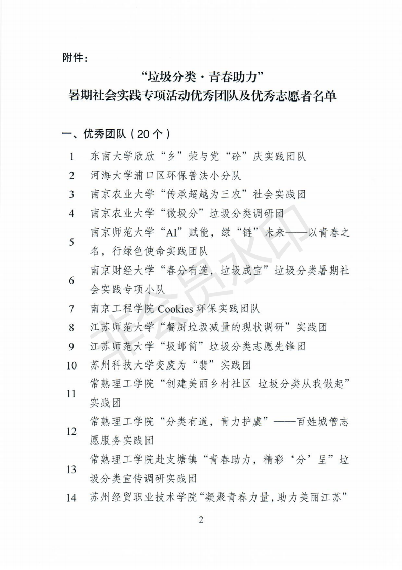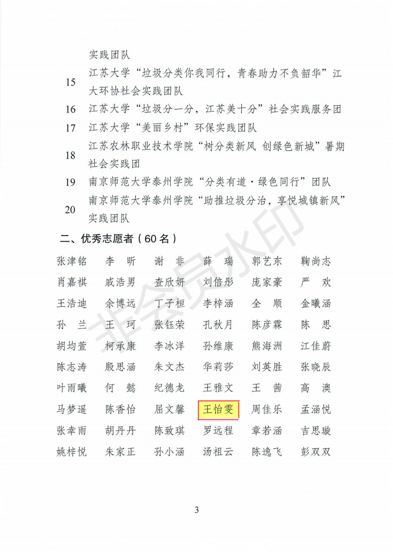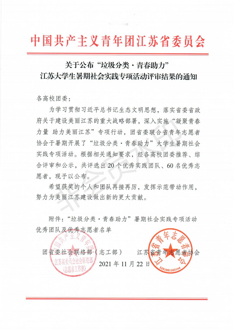 2021年11月被省团委社会联络部(志工部)评为“垃圾分类·青春助力”江苏大学生暑期社会实践专项活动优秀志愿者