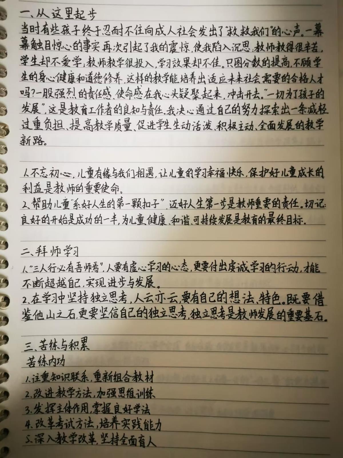 “腹有诗书气自华,读书万卷始通神。”读书是提升一个人内在气质与涵养的根本途径。导师也为我们推荐了大量的书籍文章,帮助我们在阅读的过程中获得更好的成长。在本年中,我阅读了大量书籍,并且做了相关的读书笔记与摘抄。通过阅读,我对于教师职业有了更加深刻的认识。同时,我也意识到了自身的不足,也找到了弥补这些不足的方法。书中为我展现了今后可能遇到了的问题,并且给出了相应的解决策略,帮助我去提前思考准备今后所可能遇到的问题,为我的成长指明了方向。