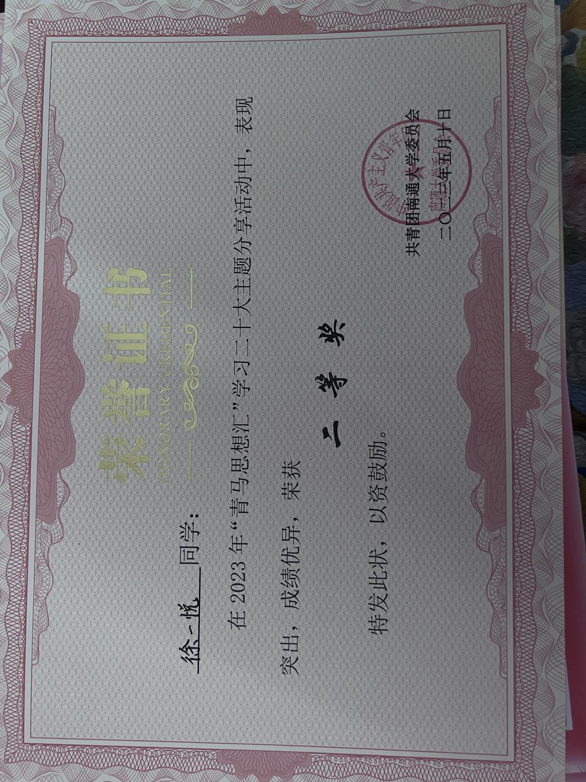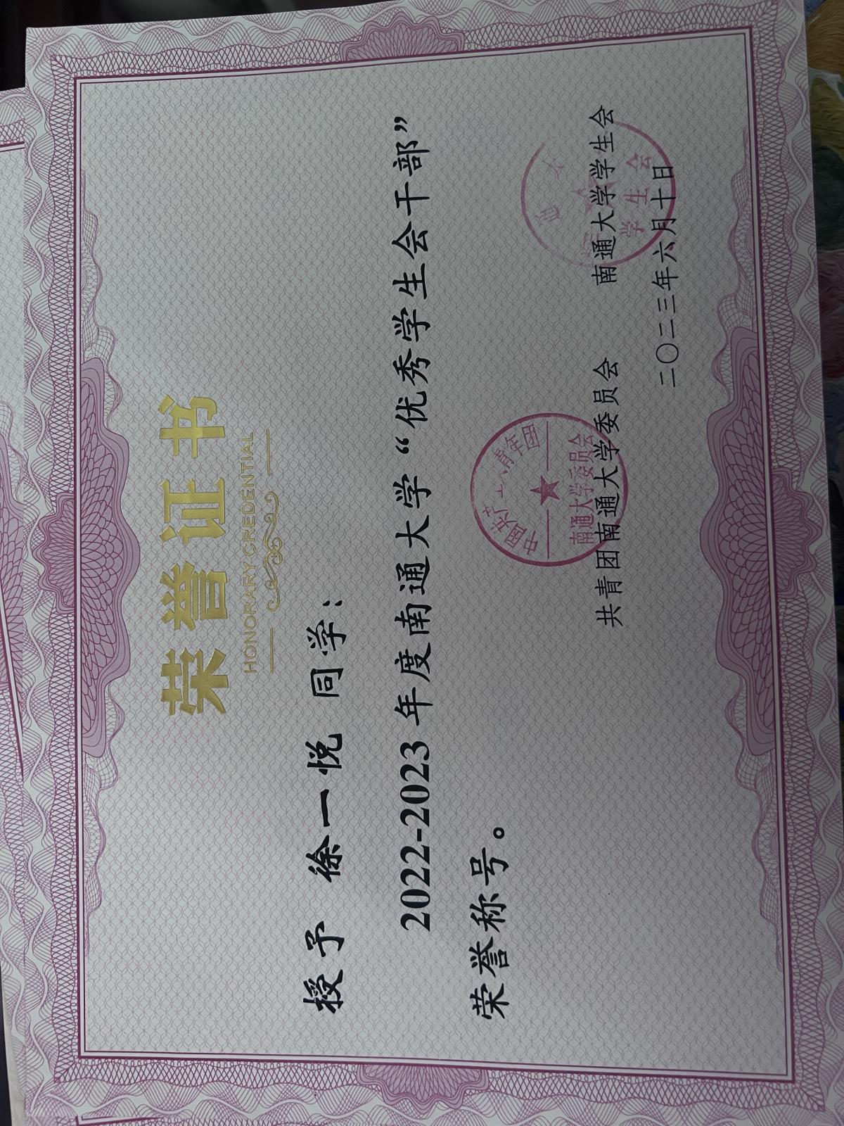 在学生工作方面,这学期我担任江苏省高校文学社团联席办综合服务部副部,南通大学学生会宣传外联部副部等职务,在菁英班的日常活动中认真学习,荣获“青马思想汇”学习二十大主题分享活动二等奖,文学院心理协会积极分子,2022-2023年度南通大学“优秀学生会干部”等荣誉。
