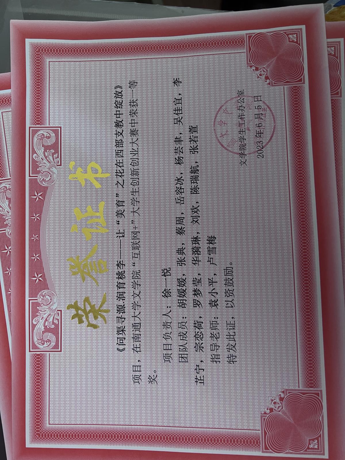 在创新创业竞赛方面,我作为负责人带领团队荣获“三下乡”社会实践策划大赛一等奖,“互联网+”创新创业大赛校赛二等奖一项、三等奖一项。