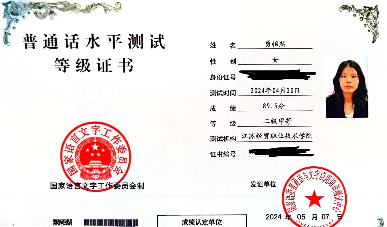 普通话水平测试等级证书