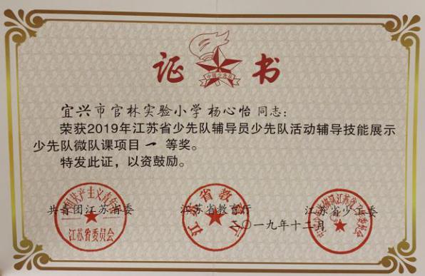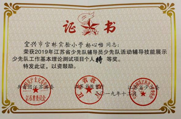 11月4日我校杨心怡老师在无锡市少先队辅导员风采大赛中获得了特等奖第一名,代表无锡出征省赛。