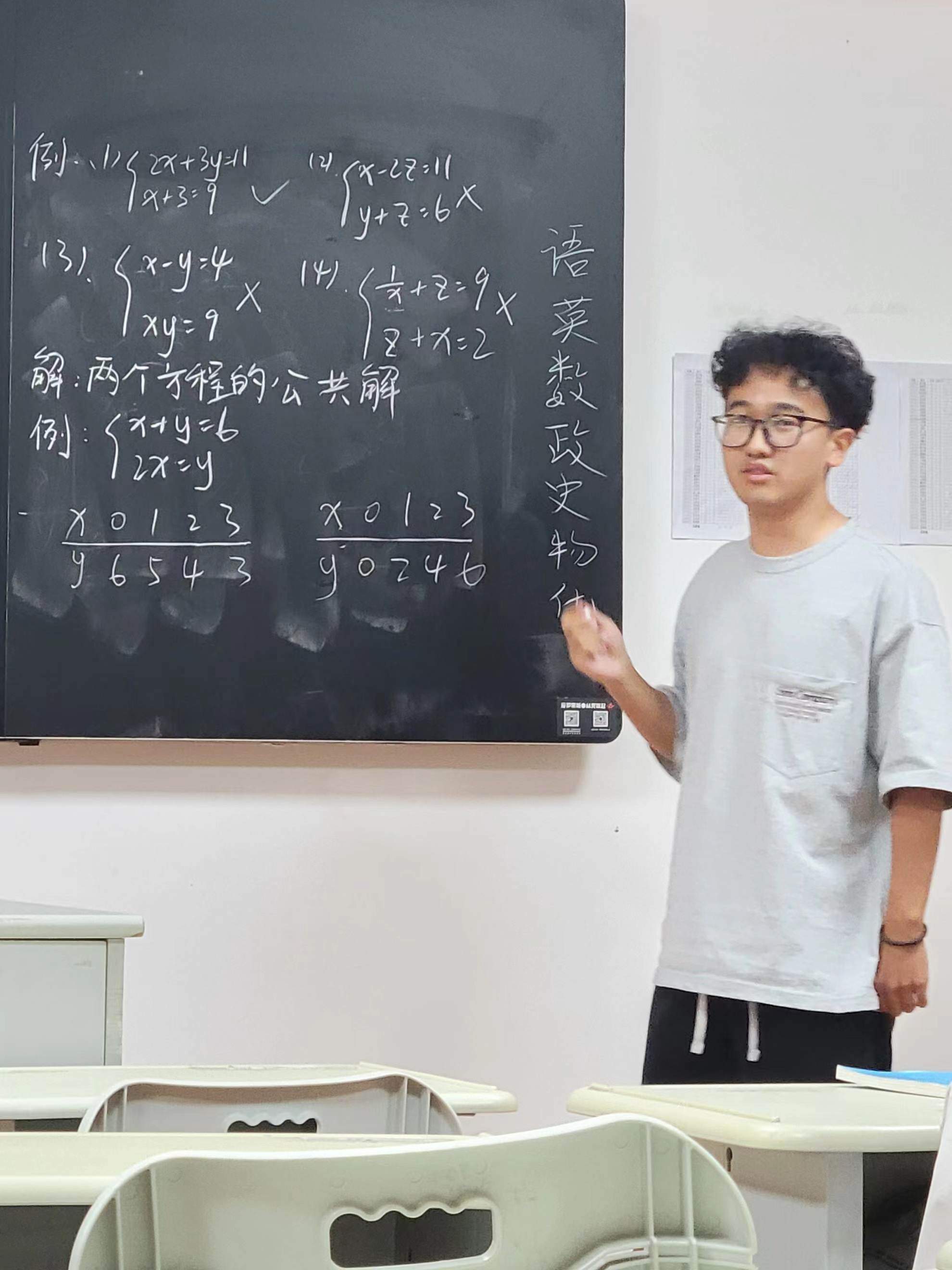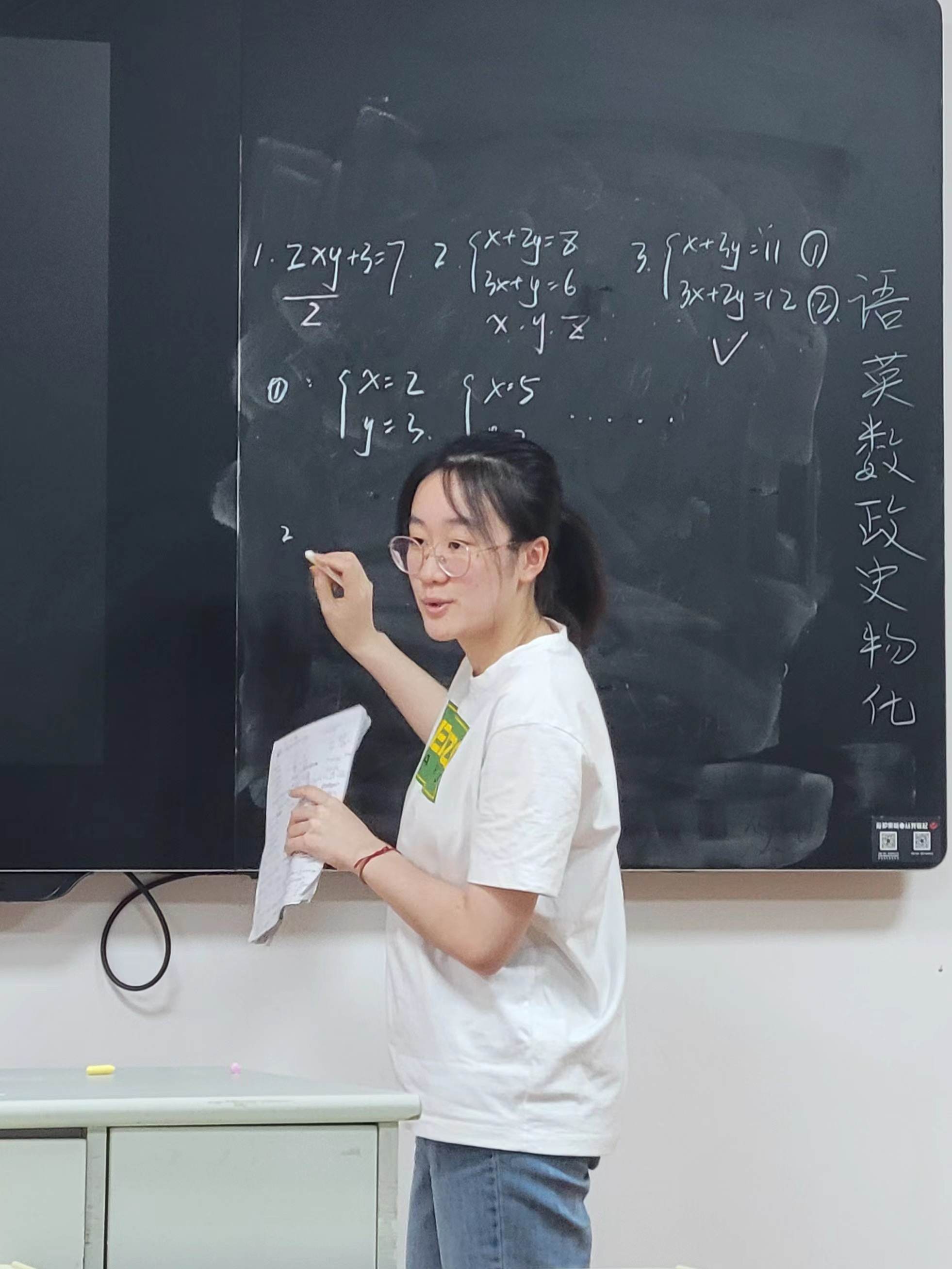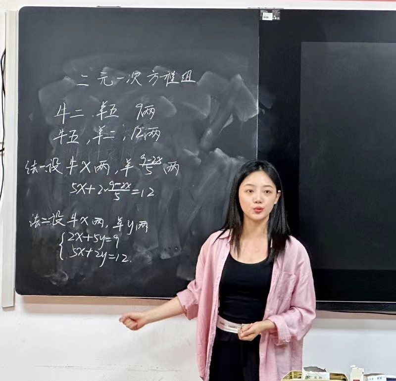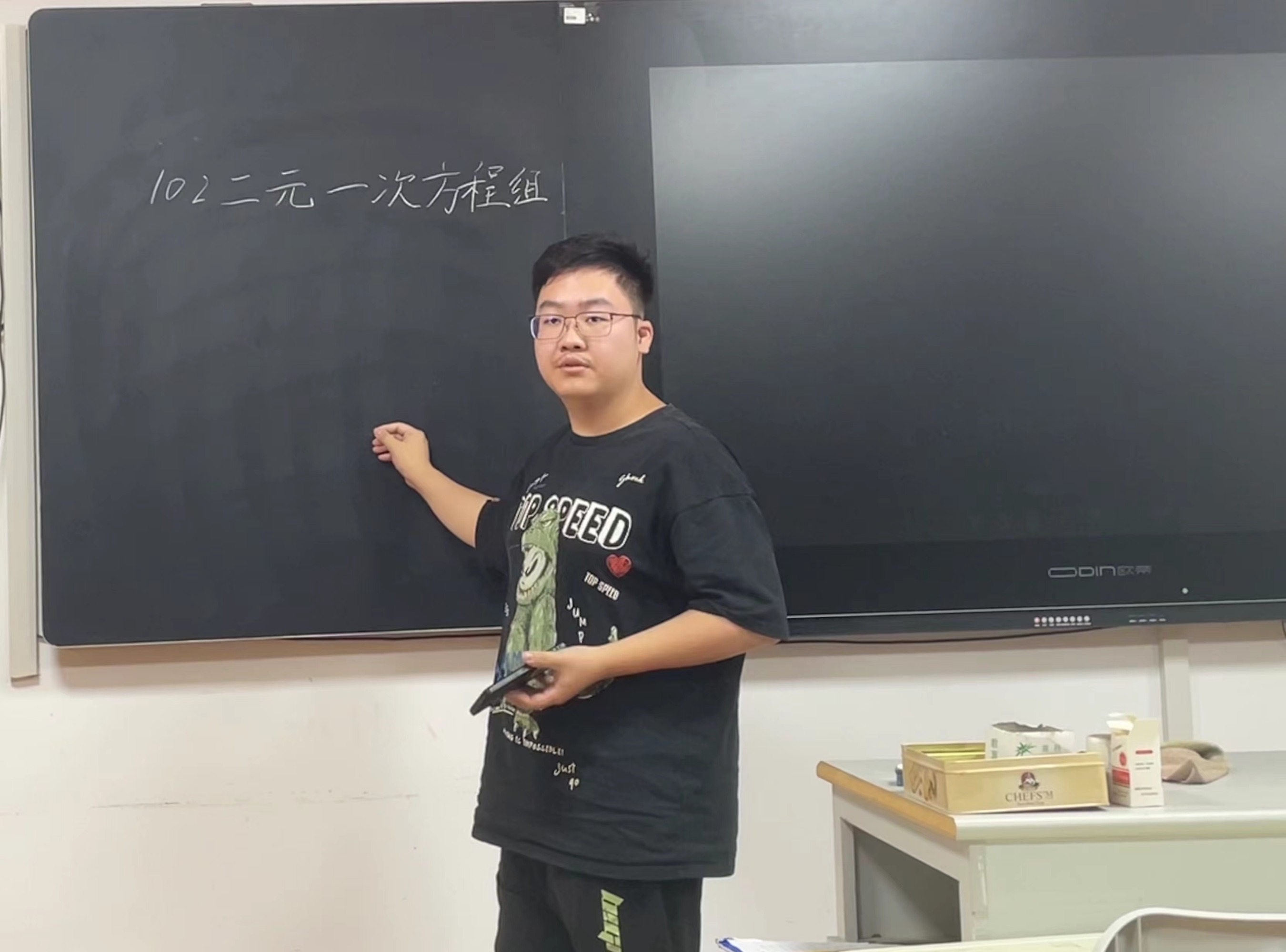 首先,在汤导师的部署下,2021级同学围绕《二元一次方程组》进行课堂展示。吴佳豪同学选取复习导入的方式,让学生回顾二元一次方程的相关知识,接着选取了两个实际问题,引导学生逐步思考,感受根据等量关系列出两个方程,从而启发学生思考所列的方程间有什么关系,引出二元一次方程组的概念。学生在得出概念的基础上,跟着教师的思路理解二元一次方程组的解。整个过程层层递进,紧扣所提出的两个实际问题展开,思路清晰。